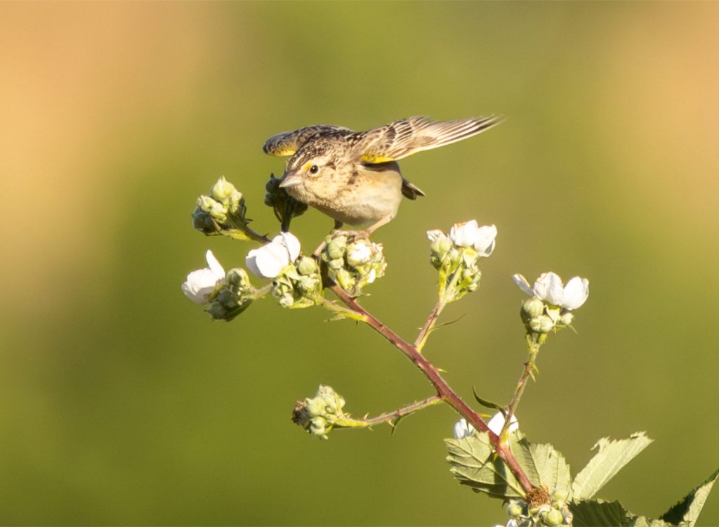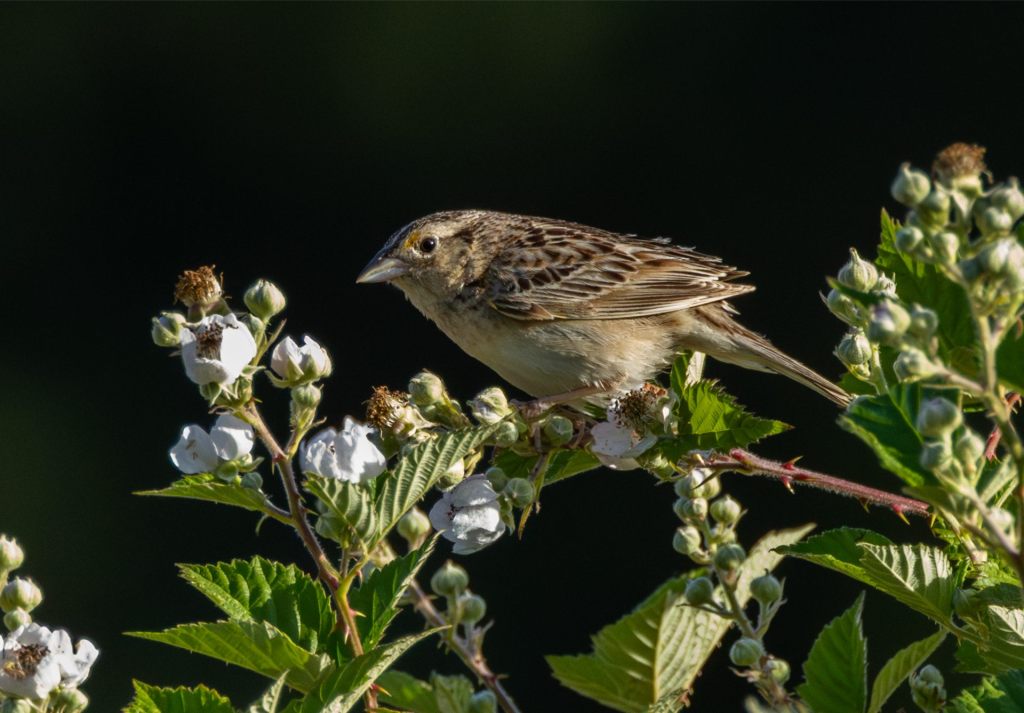 When you first hear that sound, you might not even think “bird”, but once you know it, it is unmistakable. Even if you can’t hear the song, if you are patient and persistent you have a good chance of spotting one and sometimes even two at the park, starting in early to mid May each year. They often perch along fencelines or at the top of berry bushes in more open areas. If you see a small brownish bird in such a place and it suddenly throws its head back as if to deliver something operatic, but instead you hear a dry buzz, or often enough, nothing at all, you have a Grasshopper Sparrow.