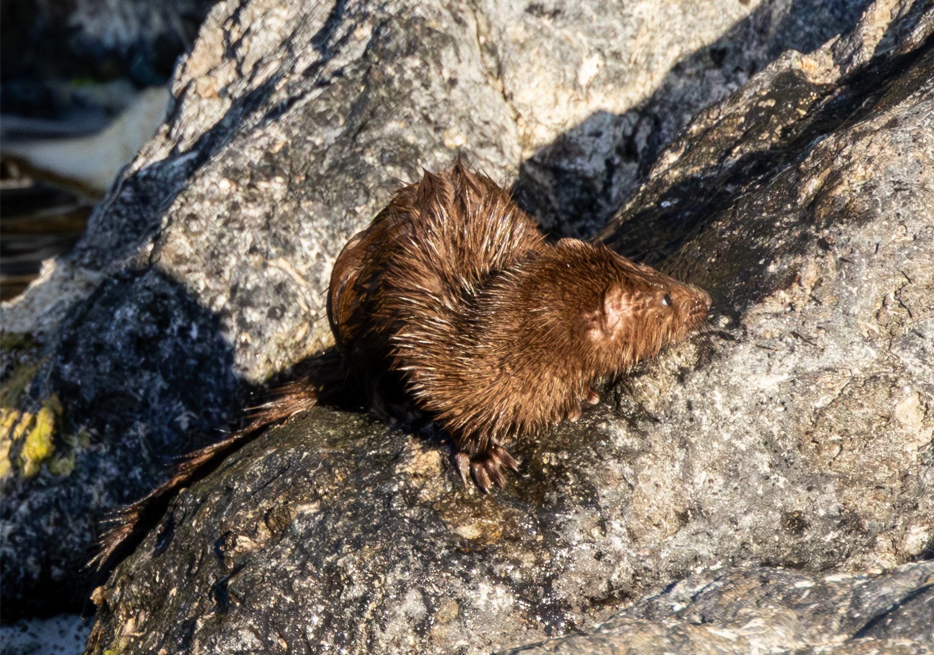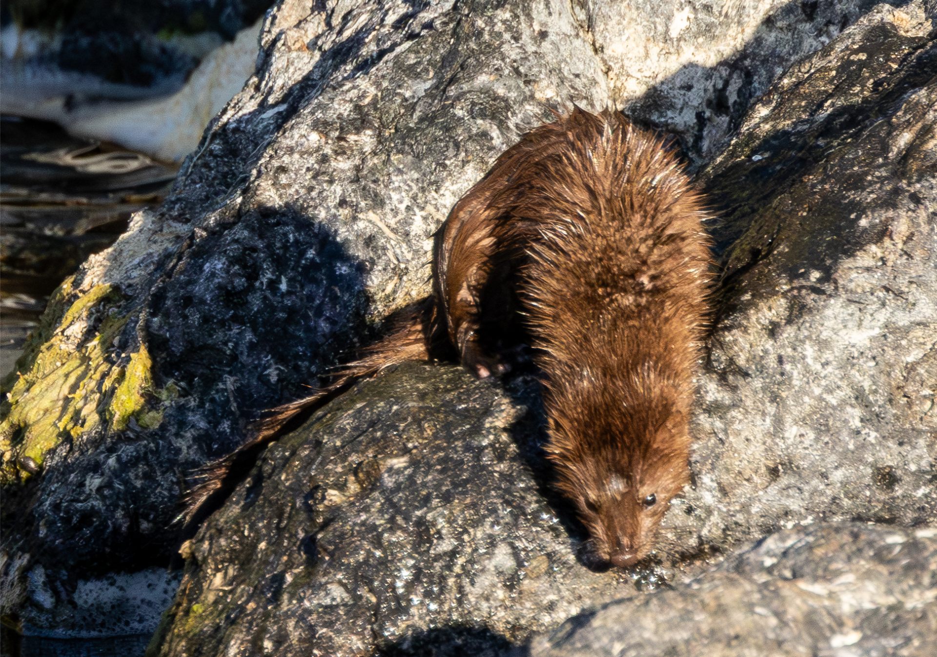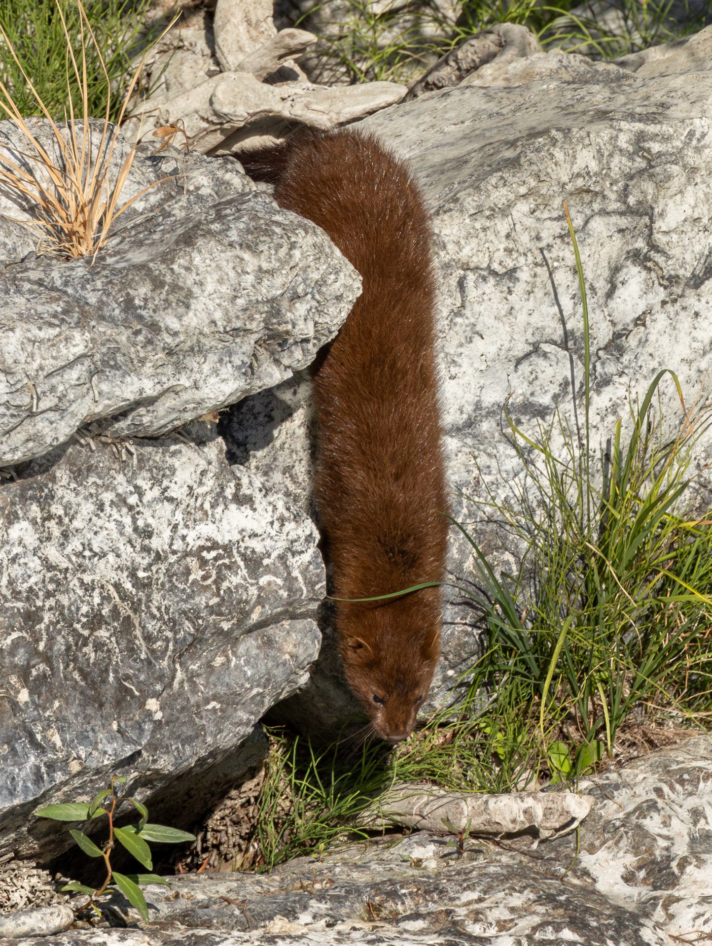 I decided to wait and see if the mink would reappear after the presumed napping, and sure enough, about 30 minutes later, the mink reappeared, perfectly dry. It began doing some kind of rhythmic marking not unlike what I have seen otters do many times. Tail erect and eyes closed, the whole animal focused on this task.