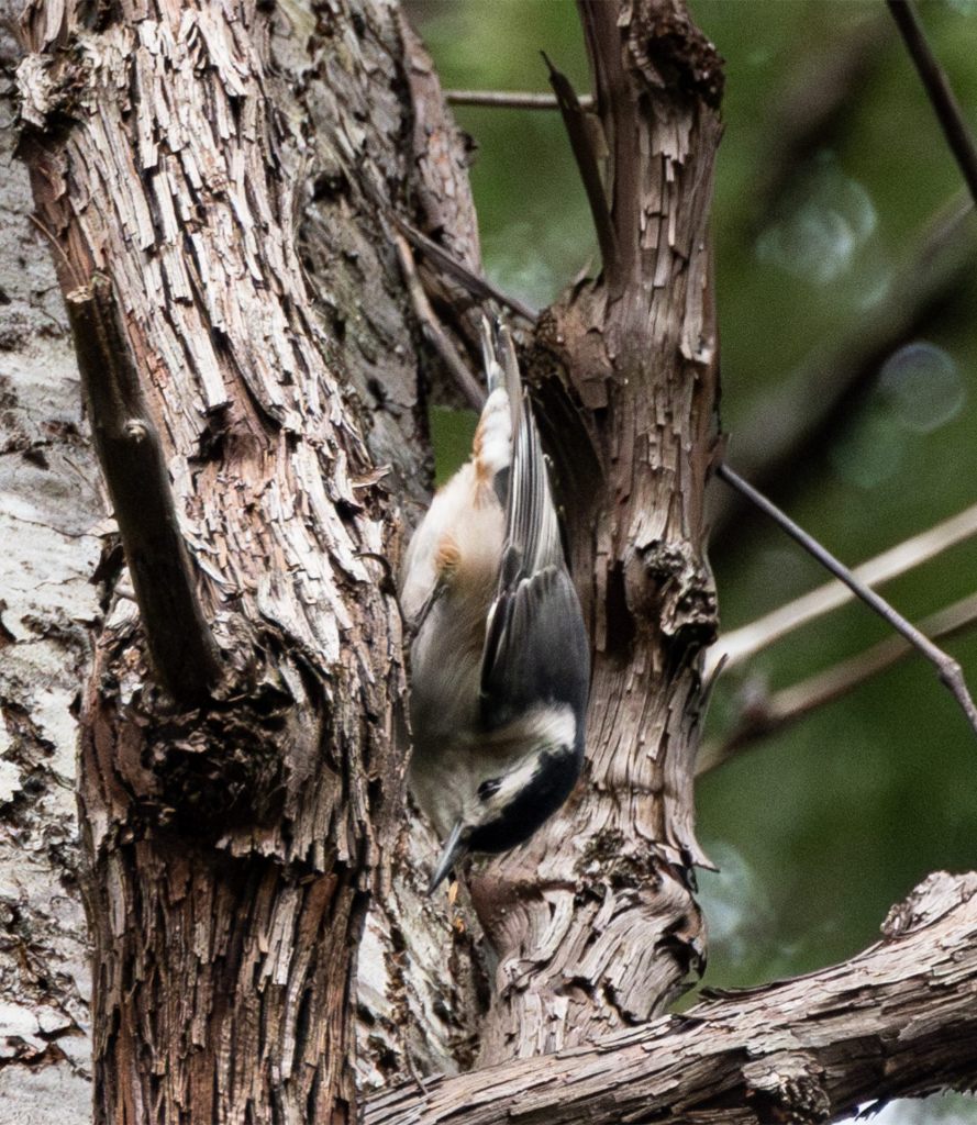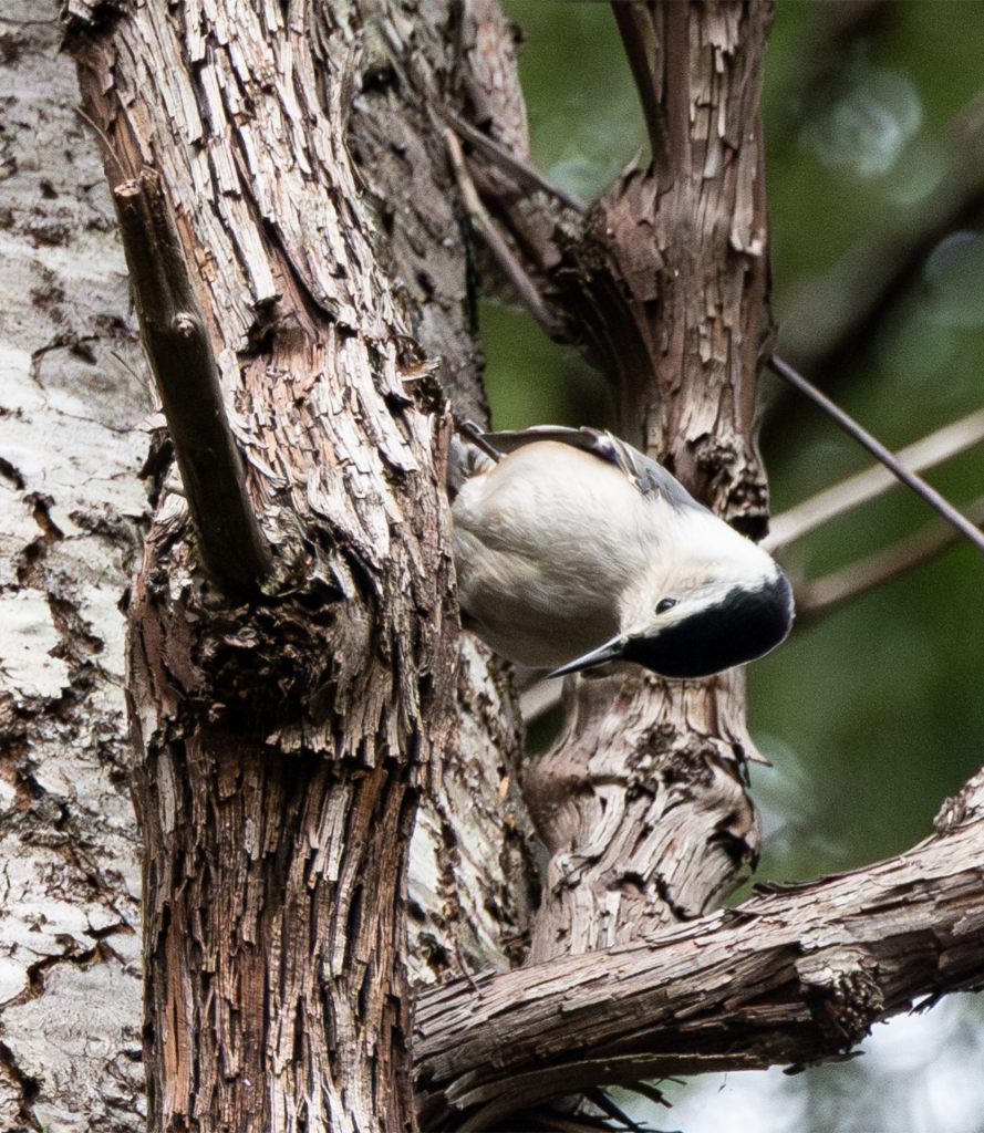 Perfectly at ease upside down, Nuthatches often descend the trunk or branch head first as they search, whereas woodpeckers usually stay upright, whether moving up or down.