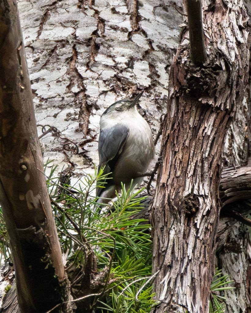 Finally, after an hour of neck-craning anticipation, a nuthatch appeared in a visible spot in a fir tree not too far out in front of me and about ten yards up. It put on a show of its unique foraging behavior and worked the area from every conceivable angle. This turned out to be my longest and best look ever in my patch.