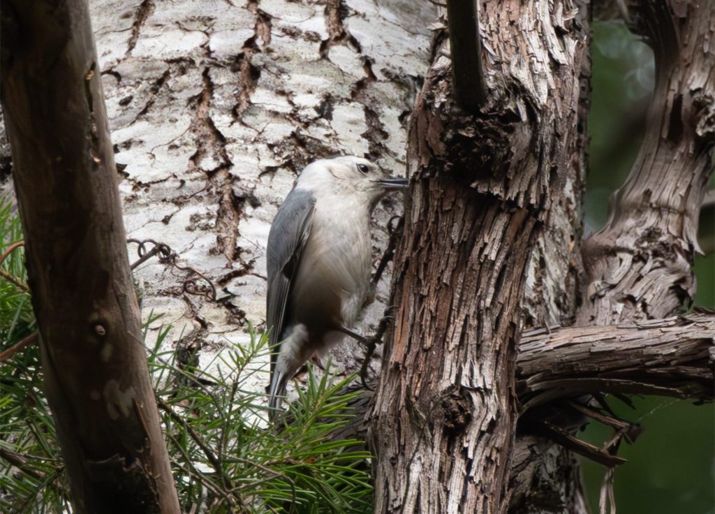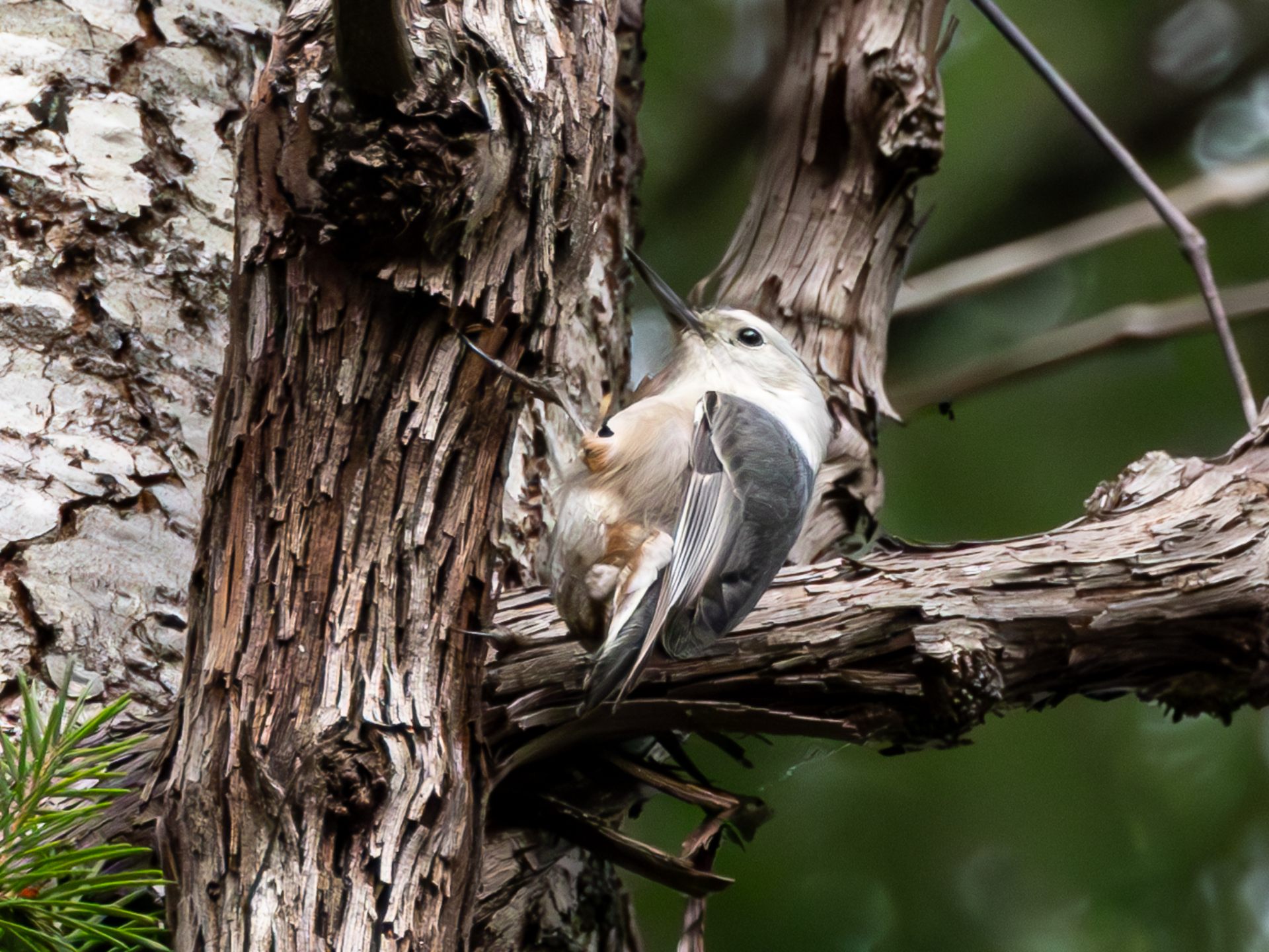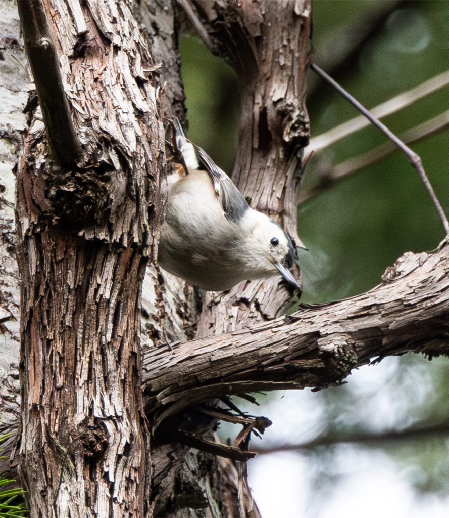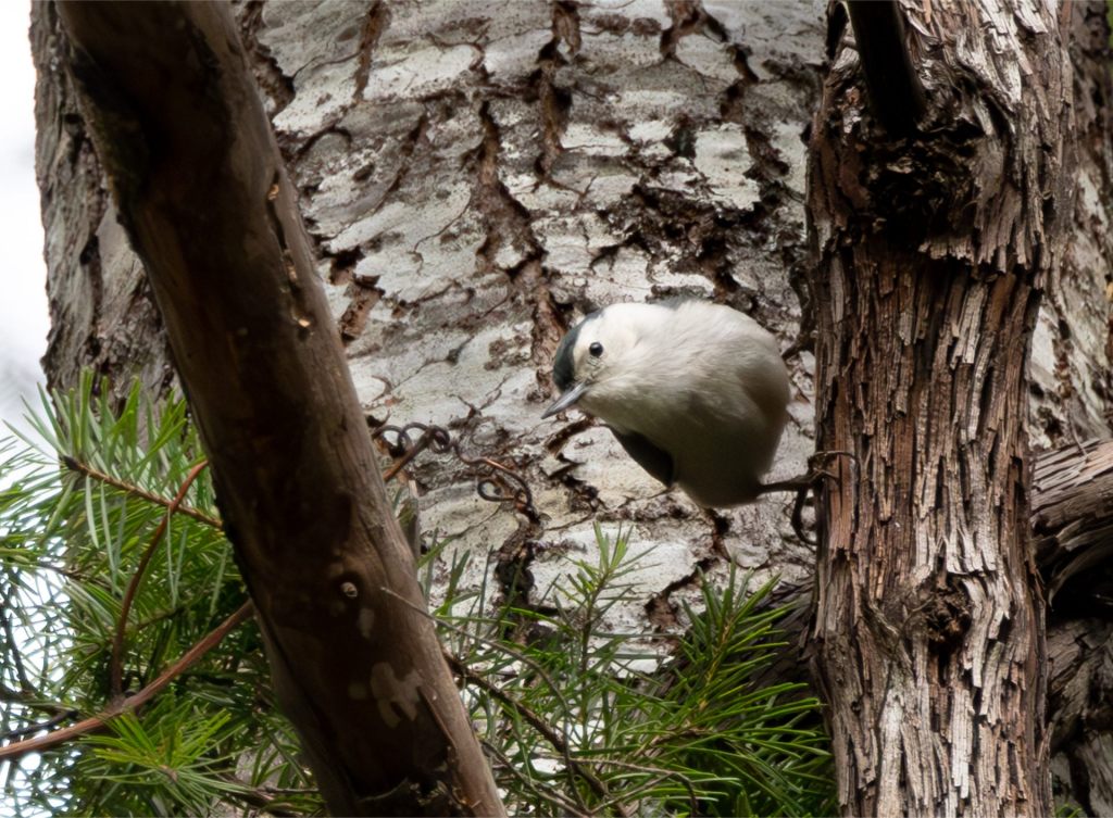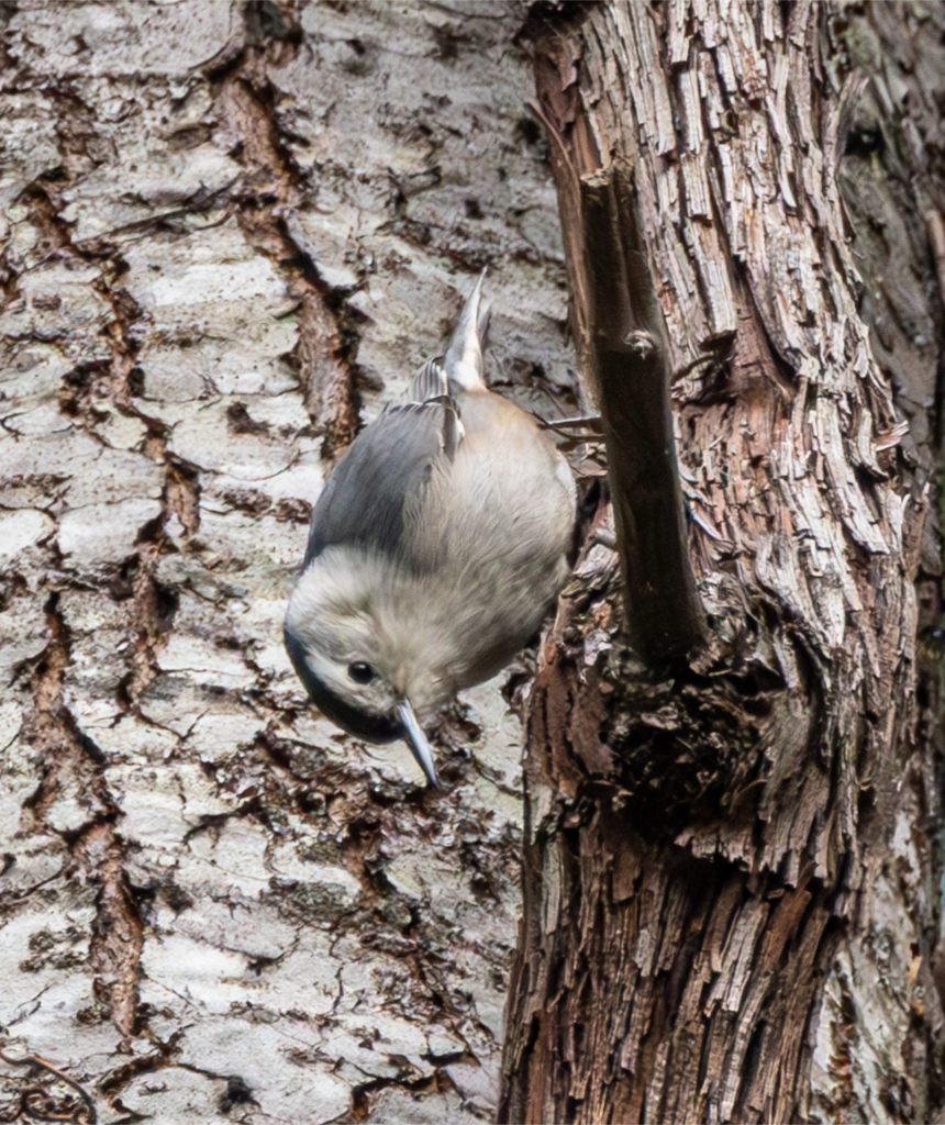 Nuthatches cling to tree trunks or branches with large strong feet and use their needle-like bills to find insects in the creases of bark, somewhat similarly to woodpeckers and the Brown Creeper. Unlike those unrelated tree-huggers, nuthatches don’t anchor themselves to trees with a strong tail, but do have the special ability to descend trunk or branches head first, and can even hang upside down when necessary to excavate bugs.
