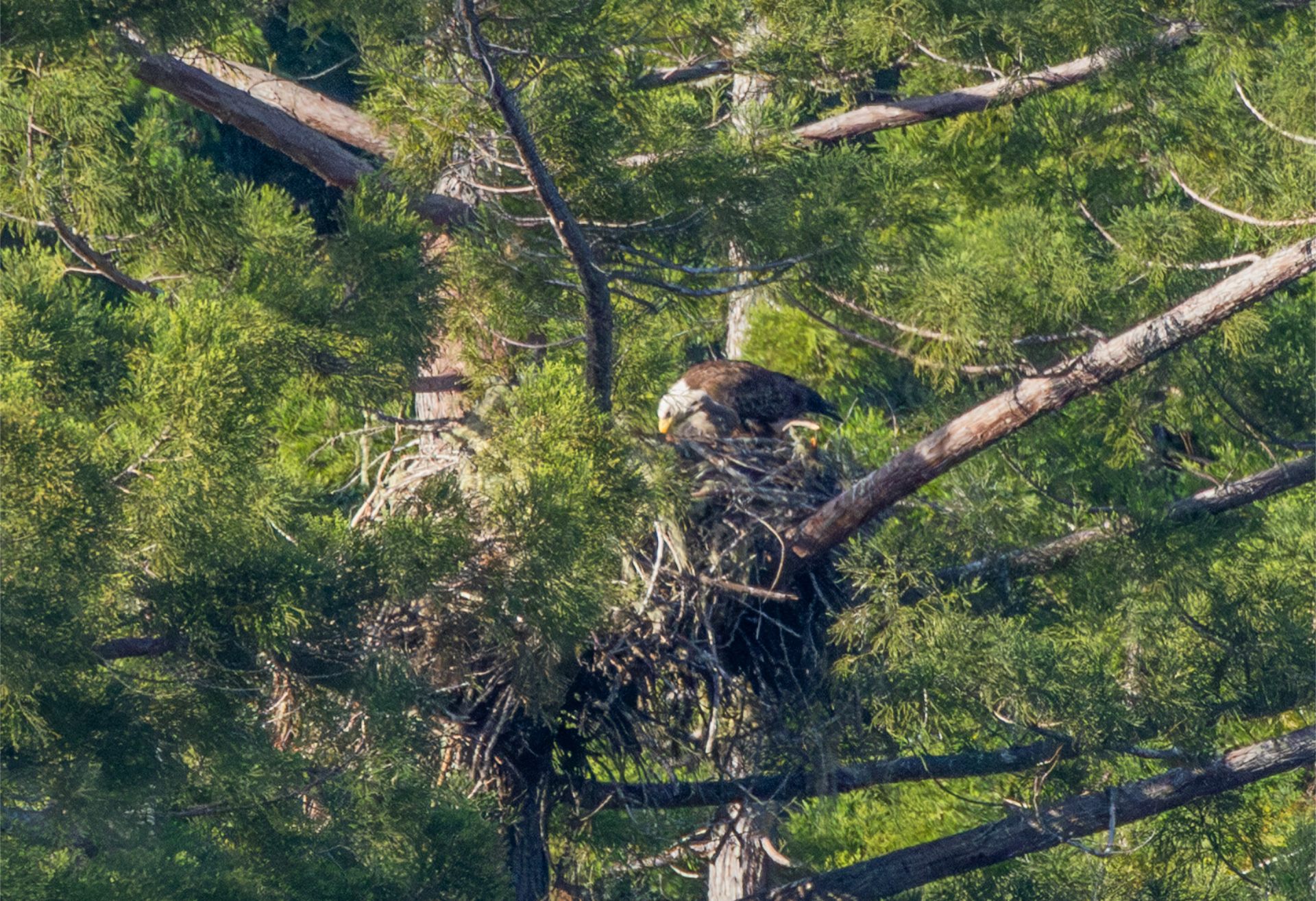 Given how poor the view could be if the baby were behind the branches that block the center and left side of the nest, I felt very lucky to get this great look of the adult and eaglet early Friday morning.