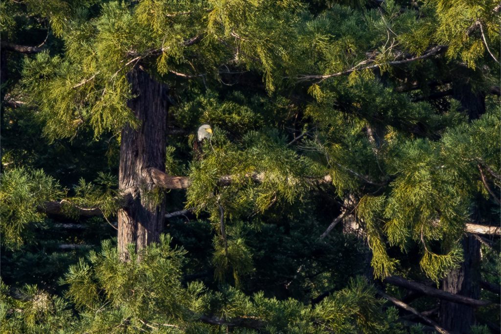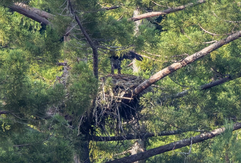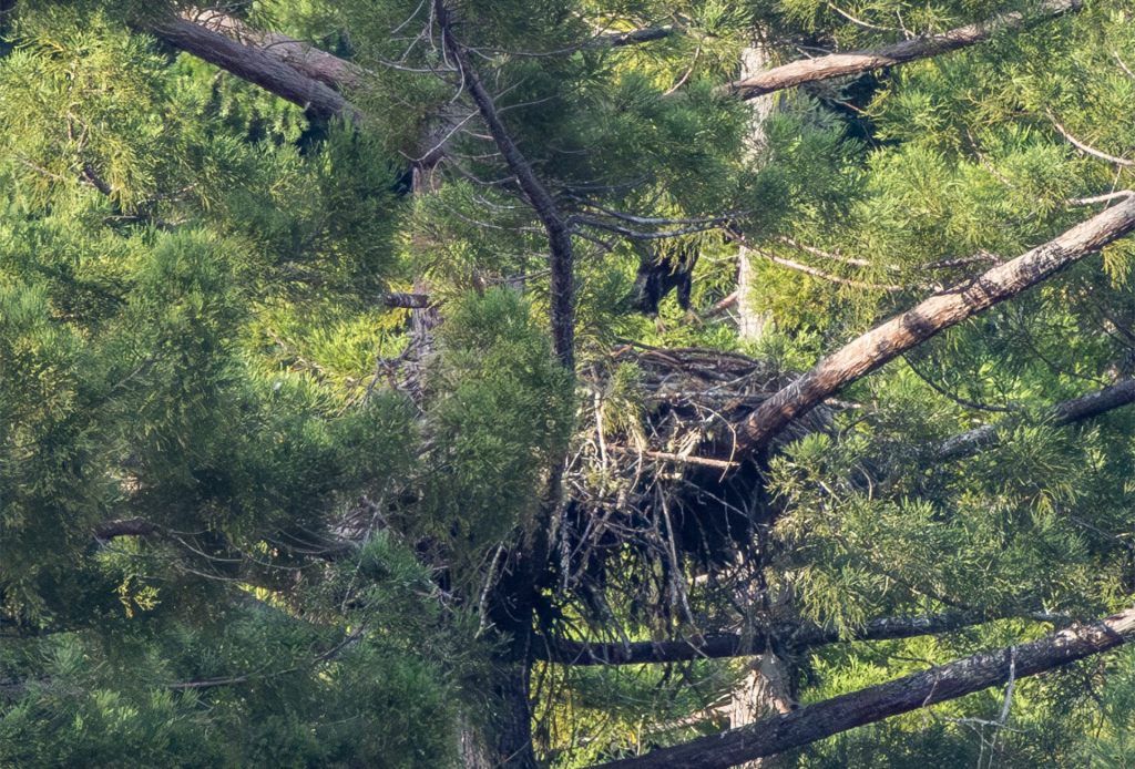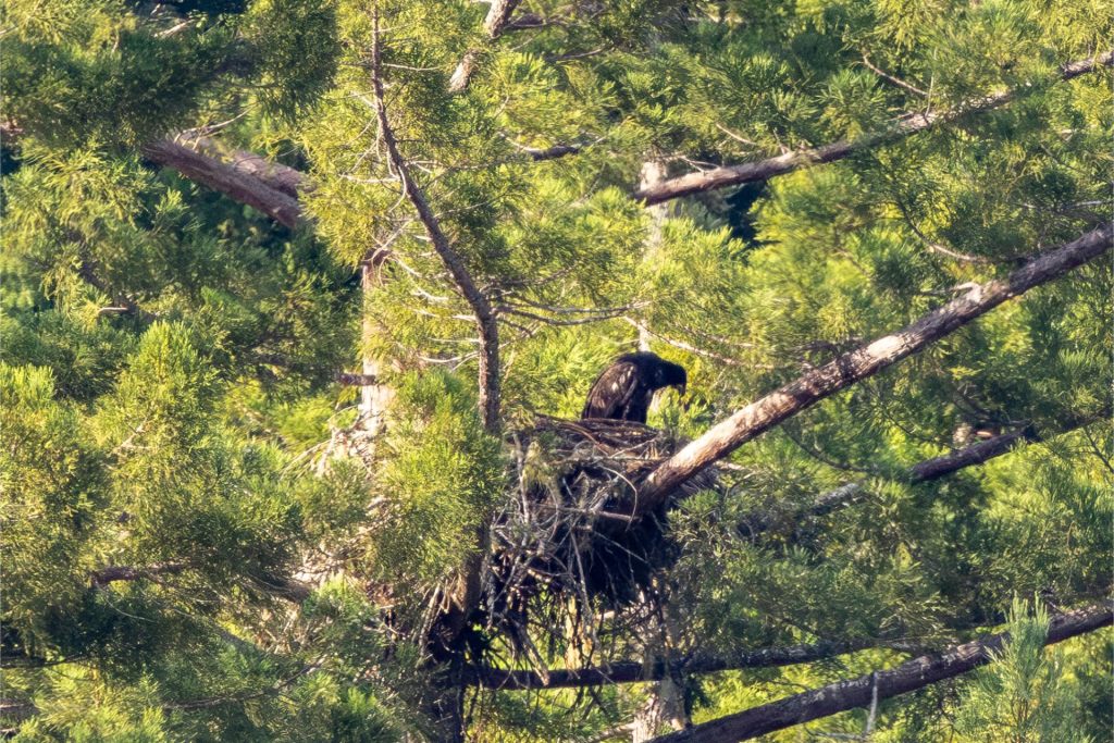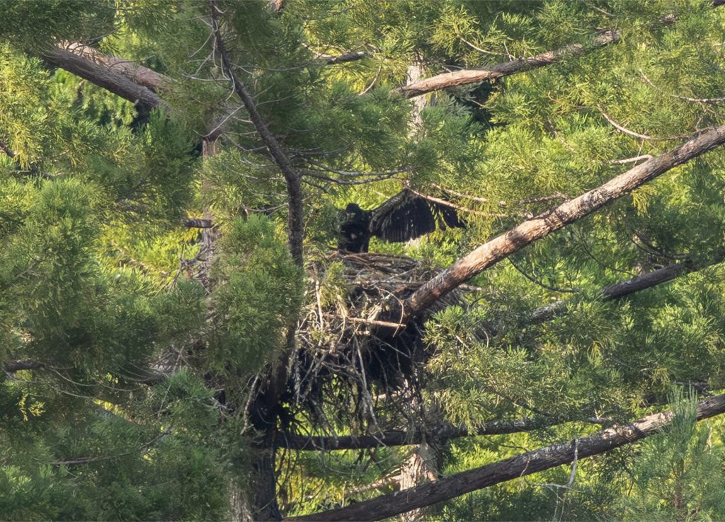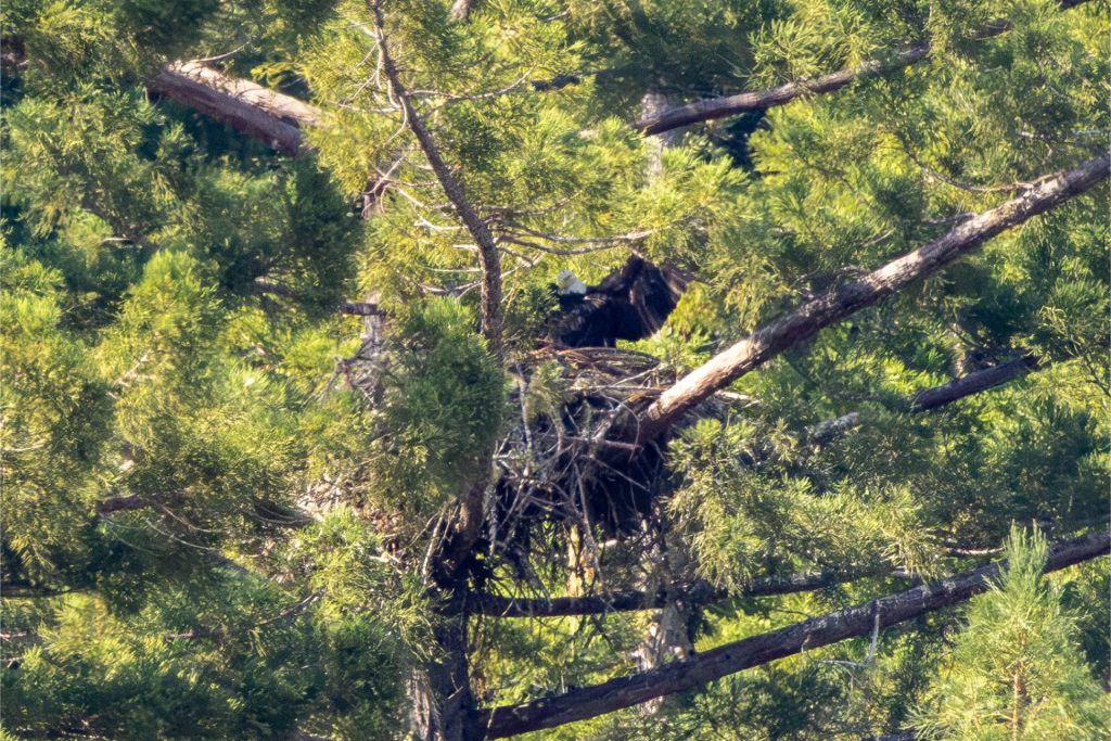 In an effort to beat the heat and the poor light that comes with it I arrived at the Benbow Bald Eagle nest watching spot at 6:20 this morning, hoping to get some good looks at the juvenile. The young eagle had other ideas, however, as it never moved, sleeping in, deep in the nest bowl until well after 7. It was a quiet morning with a beautiful sky, so I patiently waited.