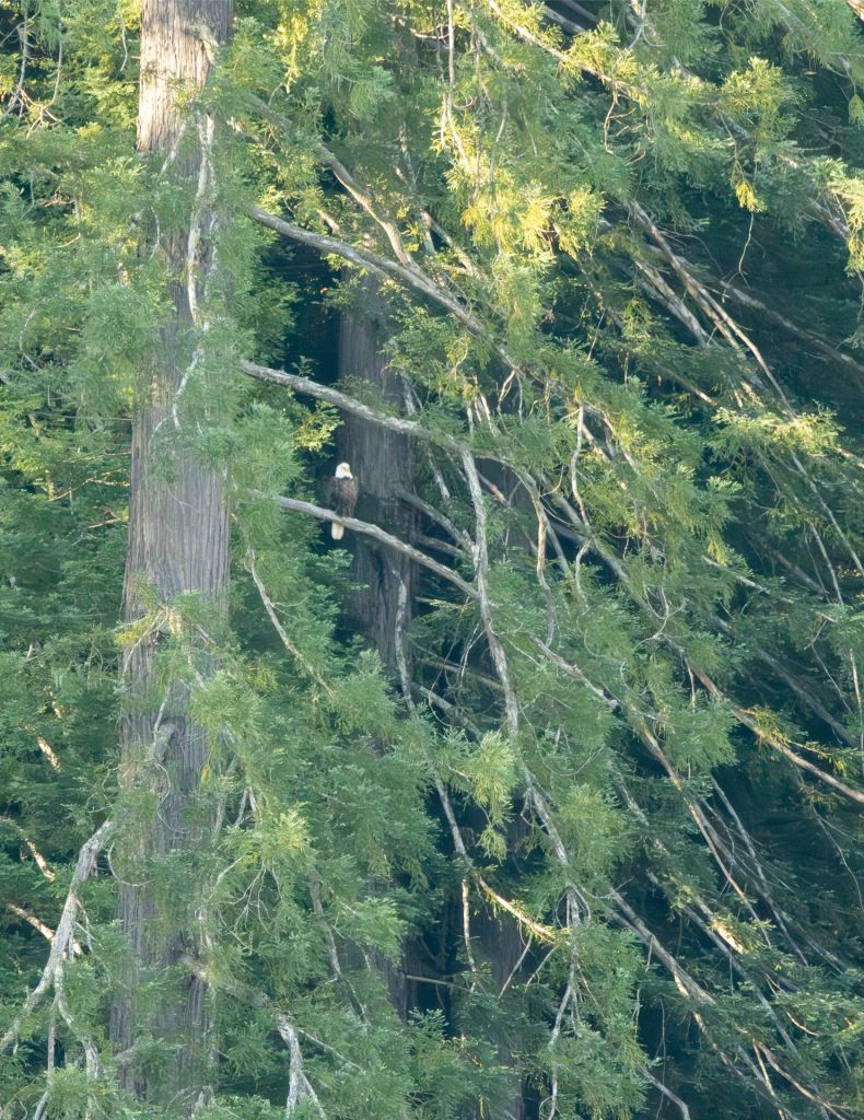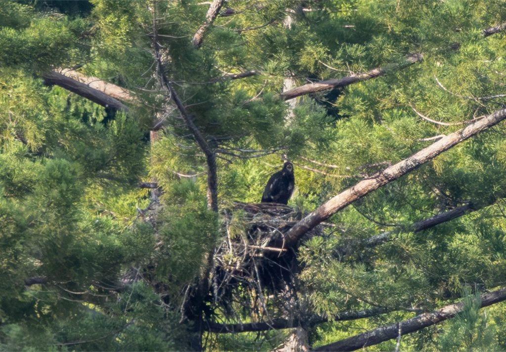 Adult Bald Eagle posted up about 25 yards from its eaglet in the nest