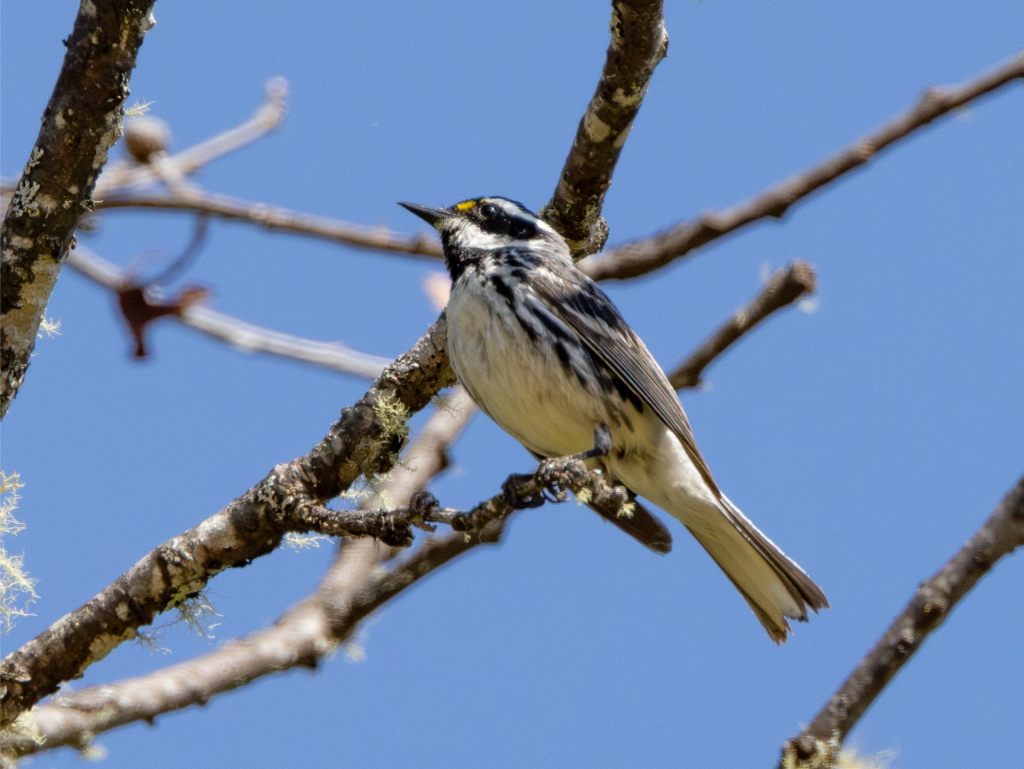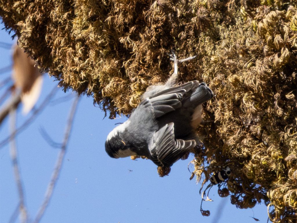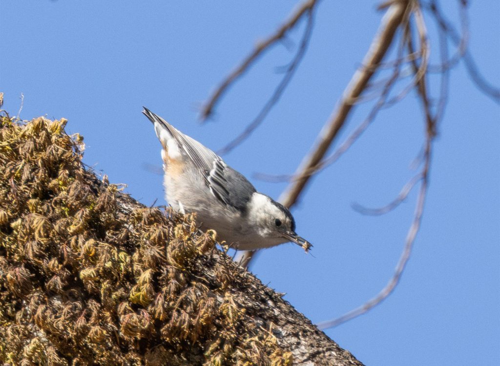 White-breasted Nuthatch is the Red-breasted’s cousin, and is slightly larger. Nuthatches have huge feet that they use to cling onto trunks and branches of trees as they glean bugs from within lichen growth as this one is doing here, or from cracks in the tree bark