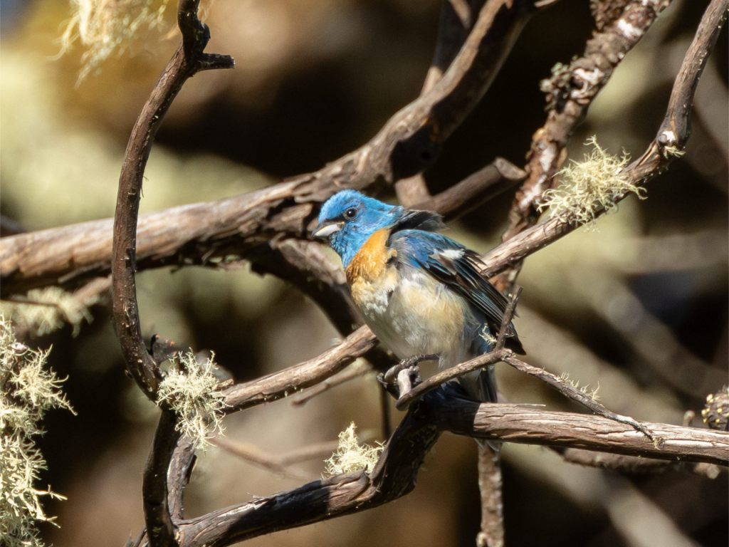 Rear view of White-breasted Nuthatch as he forages in the lichen.