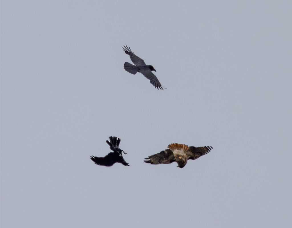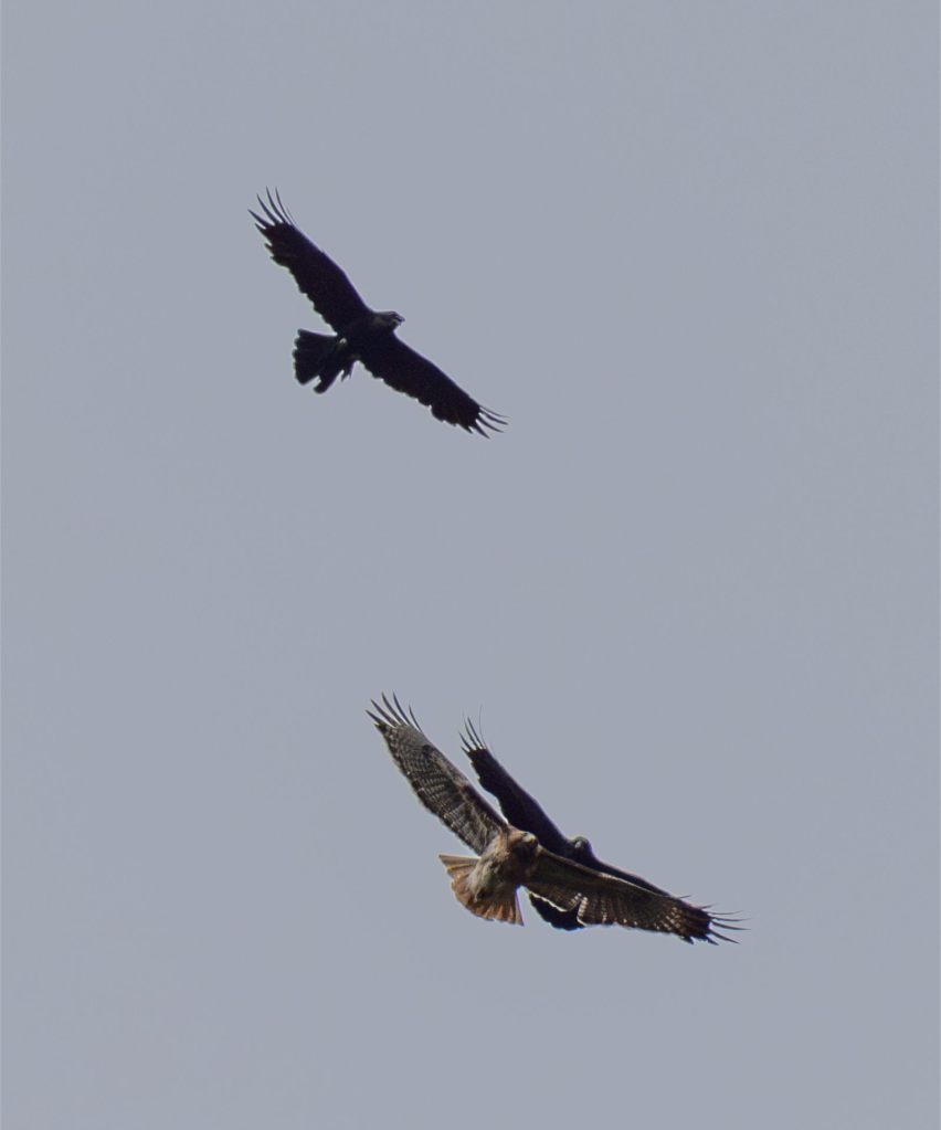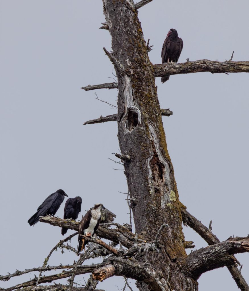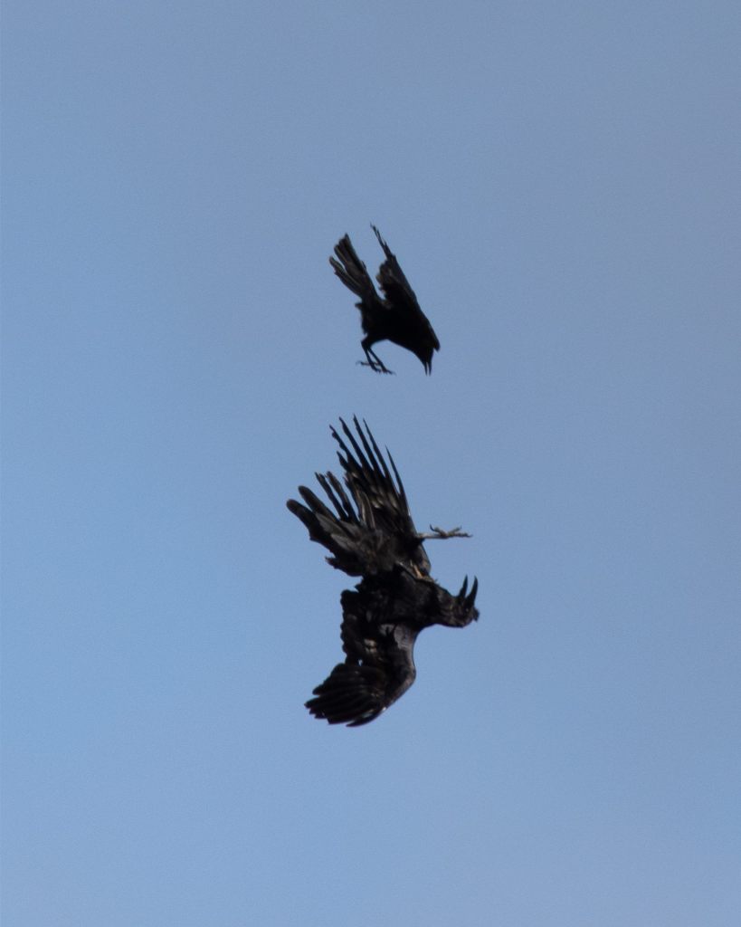 When there was just a stub of a tail left of the fish, a pair of Ravens showed up. I expected them to harass the Osprey and cause it to fly off with or as they were likely hoping, drop the end of its breakfast, but instead, they just stood by.