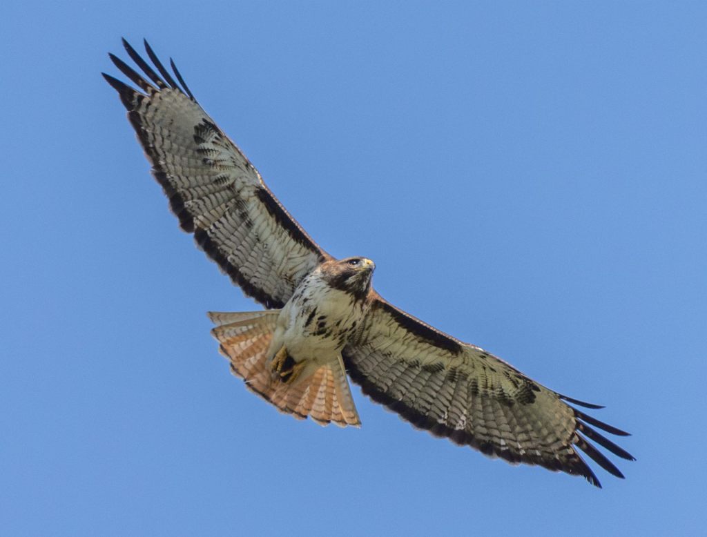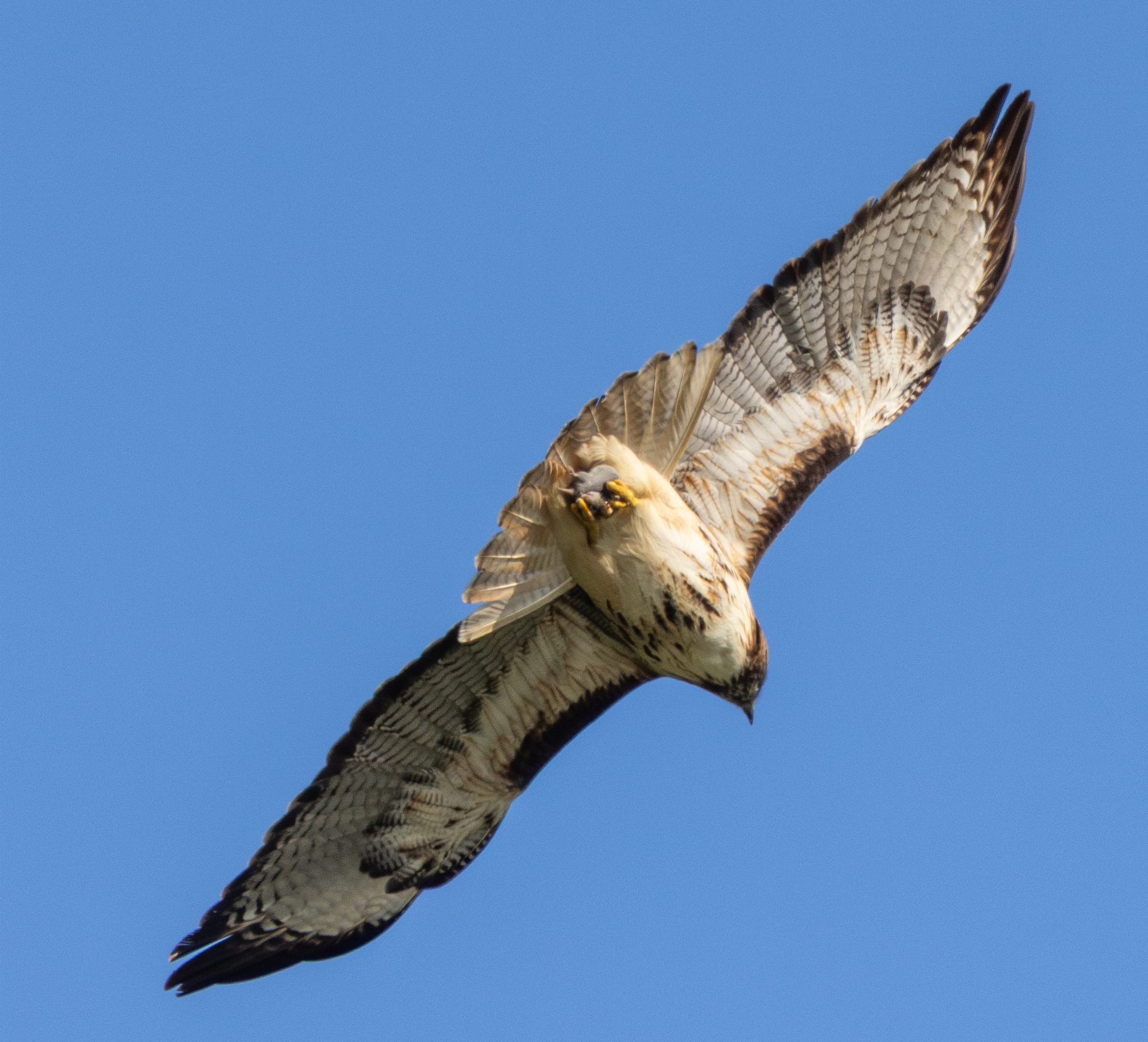 I believe this is the male of my local Red-tailed Hawk pair. He has a vole tucked under his feet, likely a meal for his young in the nest.