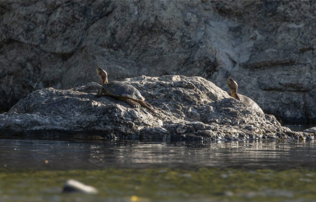 A couple of Northwestern Pond Turtles climb out of the water to bask in the early morning sun.