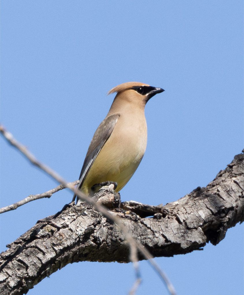 Usually seen in large groups swarming fruit trees or catching insects, this lone Cedar Waxwing visited the river.