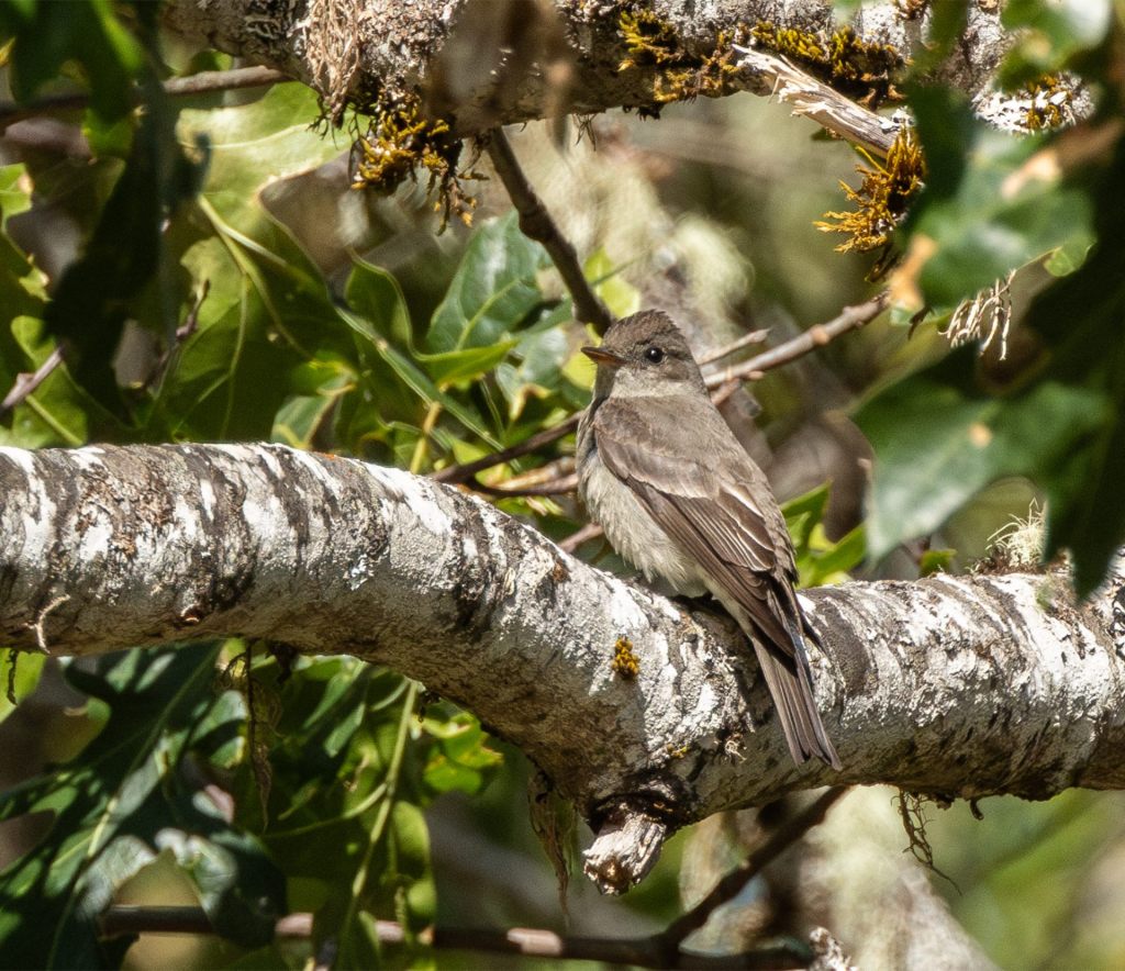 This is a Western Wood Pewee. Its song, a repeated dull, buzzy, descending note, is about as plain as its appearance. Around here it is one of the last to arrive during spring migration. It also tends to stay into early fall.