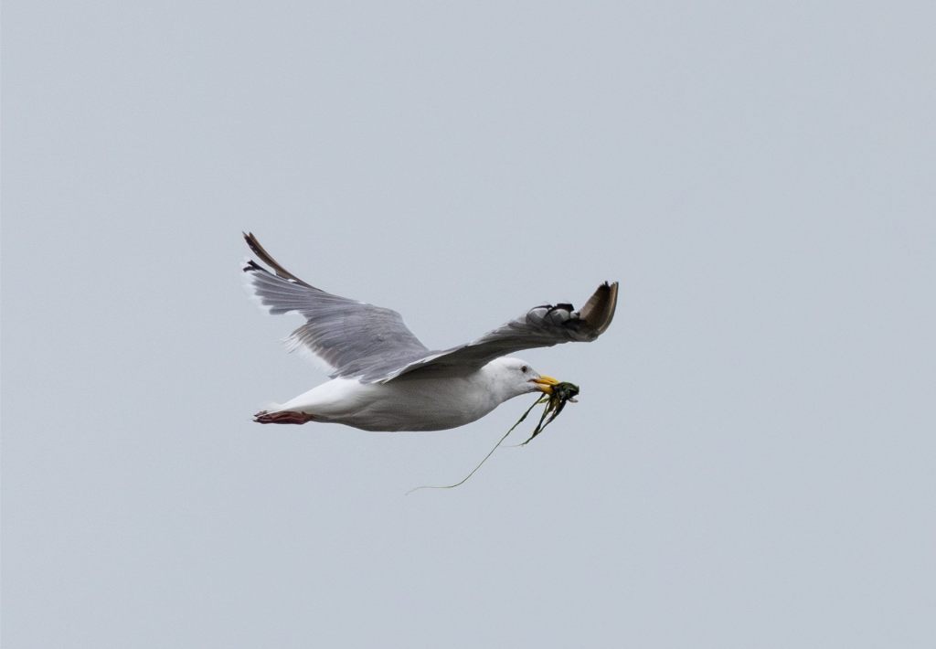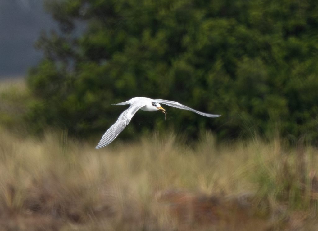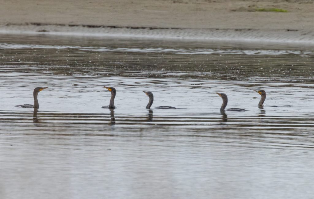 Snowy Egrets are much smaller than their “Great” cousins and much more active in their hunting habits,They stir up food by shaking their orange feet as they stride along muddy bottoms. A molting Western Gull with a small crab hidden in plant matter, probably looking for a private place to consume it away from competitionDouble-crested Cormorant water ballet. This species sometimes appears along the river in Southern Humboldt.This aptly named bird, the Elegant Tern, nests in colonies in Mexico and then disperses both north and south. Terns dive for fish, and this juvenile, told by the silver feathers on the back of its body and wings, has made a nice catch.During breeding season, the black on the tern’s head will fill in where the white looks like a balding patch.