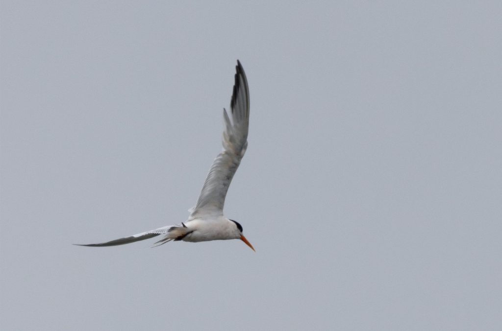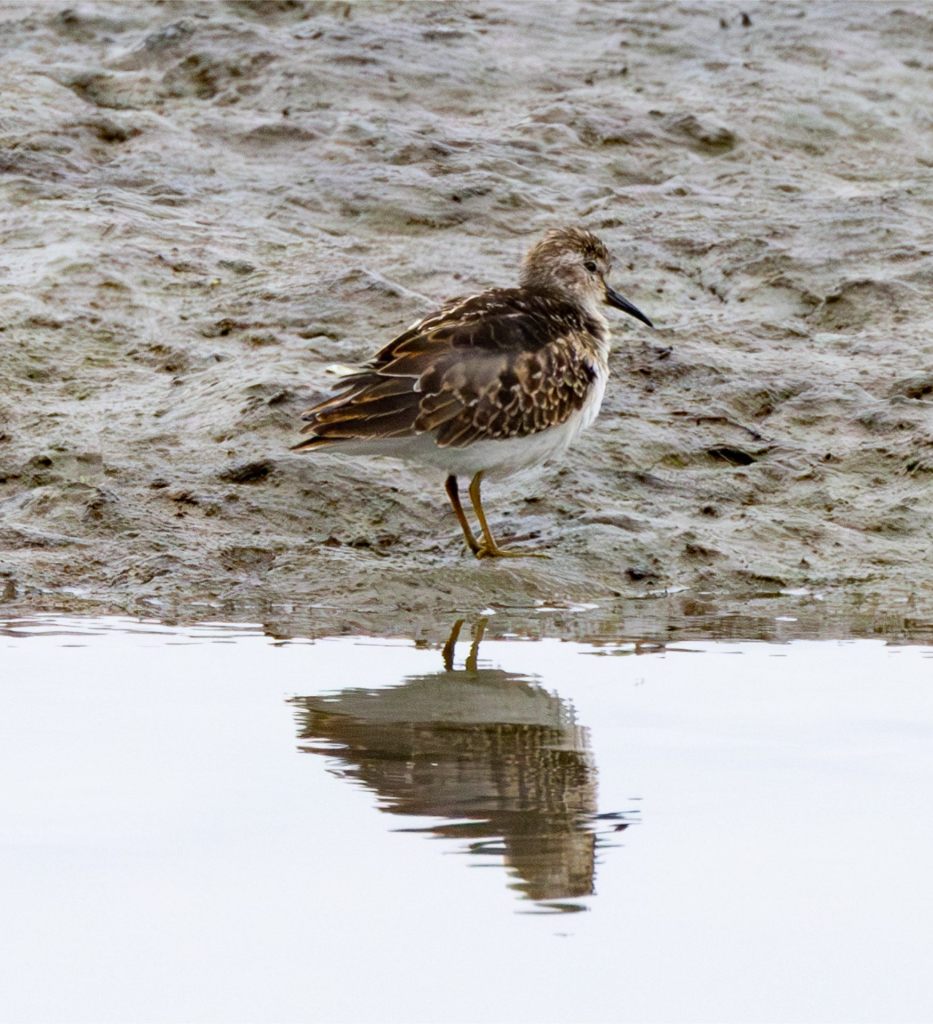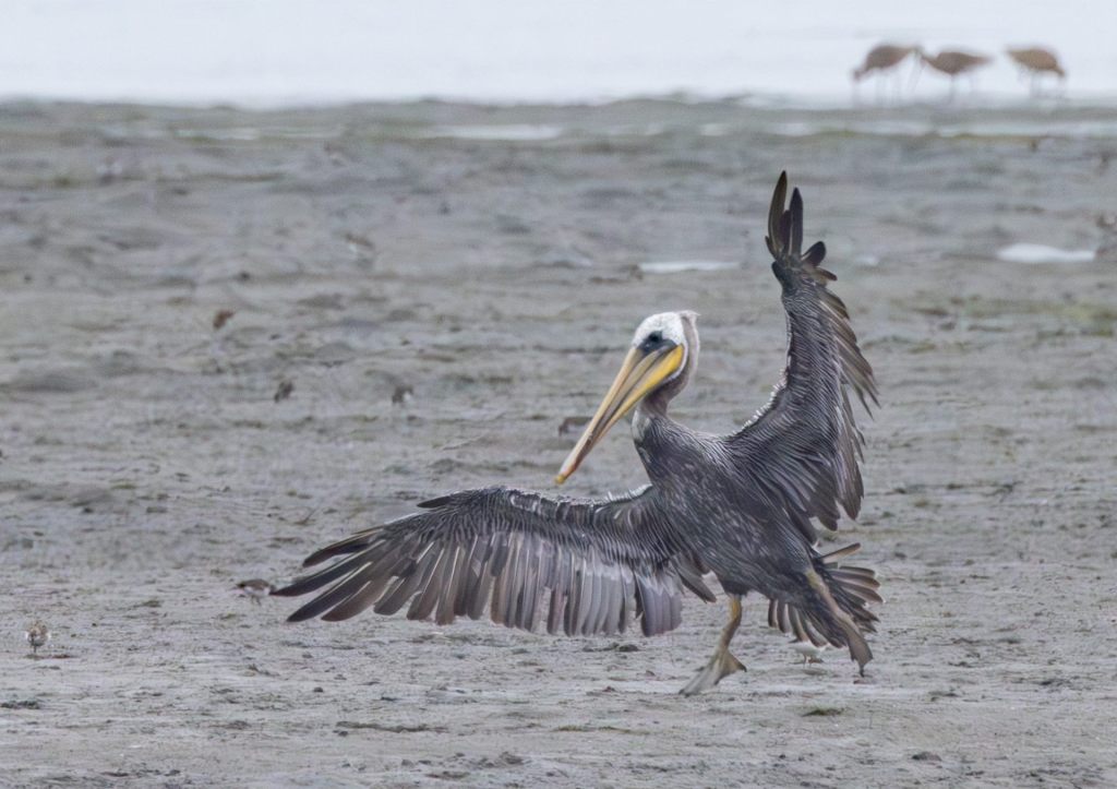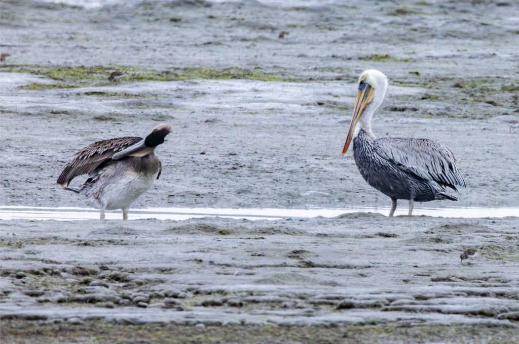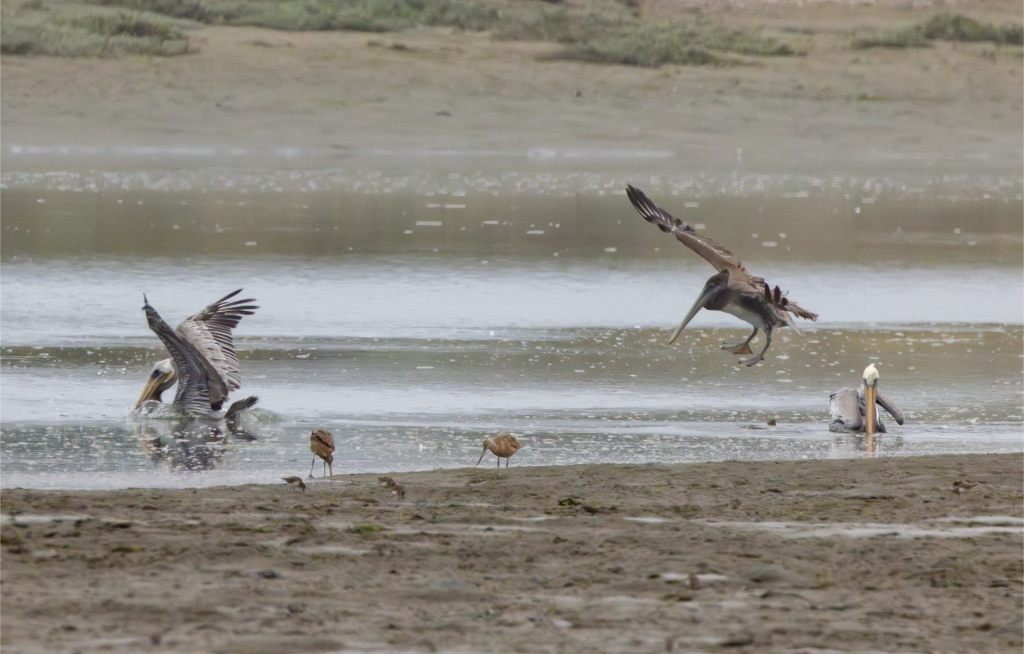 The Brown Pelican, saved from likely extinction by the 1972 banning of the pesticide DDT, was well represented with quite a few adults and juveniles. Awkwardly beautiful, these heavy birds are known for their acrobatic diving abilities, scooping up fish prey and then storing the catch in the seemingly infinitely expandable gular pouch attached to the lower bill and throat. But on this morning, they were mostly resting on land or paddling about the slowly rising shallows of the estuary.