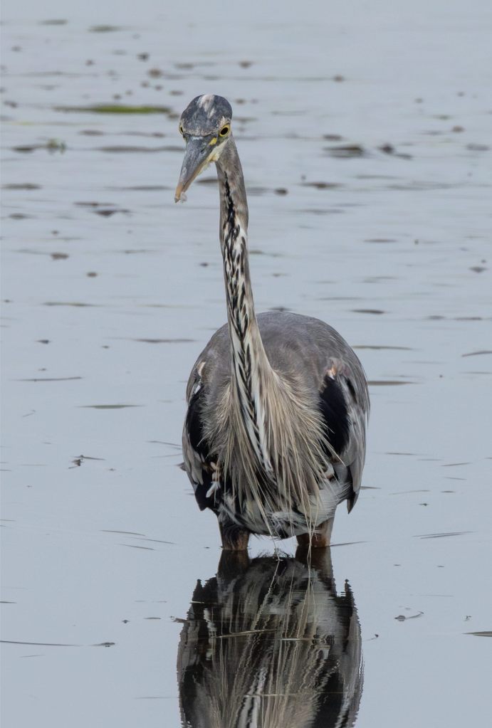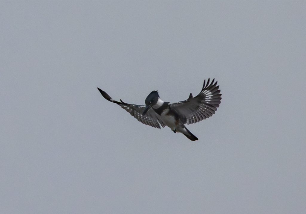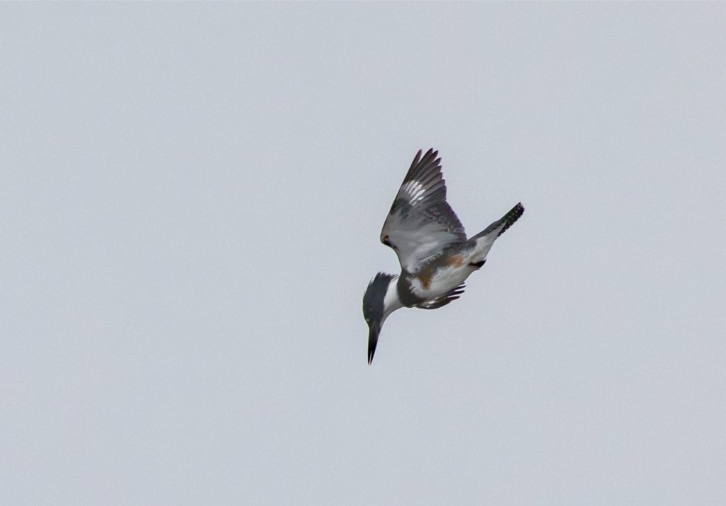 Great Egret in the classic flight pose. You can see the symmetrical molt pattern in the wings.Great Blue Heron with a tiny morsel of food.Great Blue HeronI see Belted Kingfishers often on the river this time of year, so it’s fun to compare the way they fish in the two different environments.It is fairly rare to see this hovering fishing strategy of the Belted Kingfisher at home along the river, but around the Bay, it is quite common.The start of a dive that did not end up producing a catch.