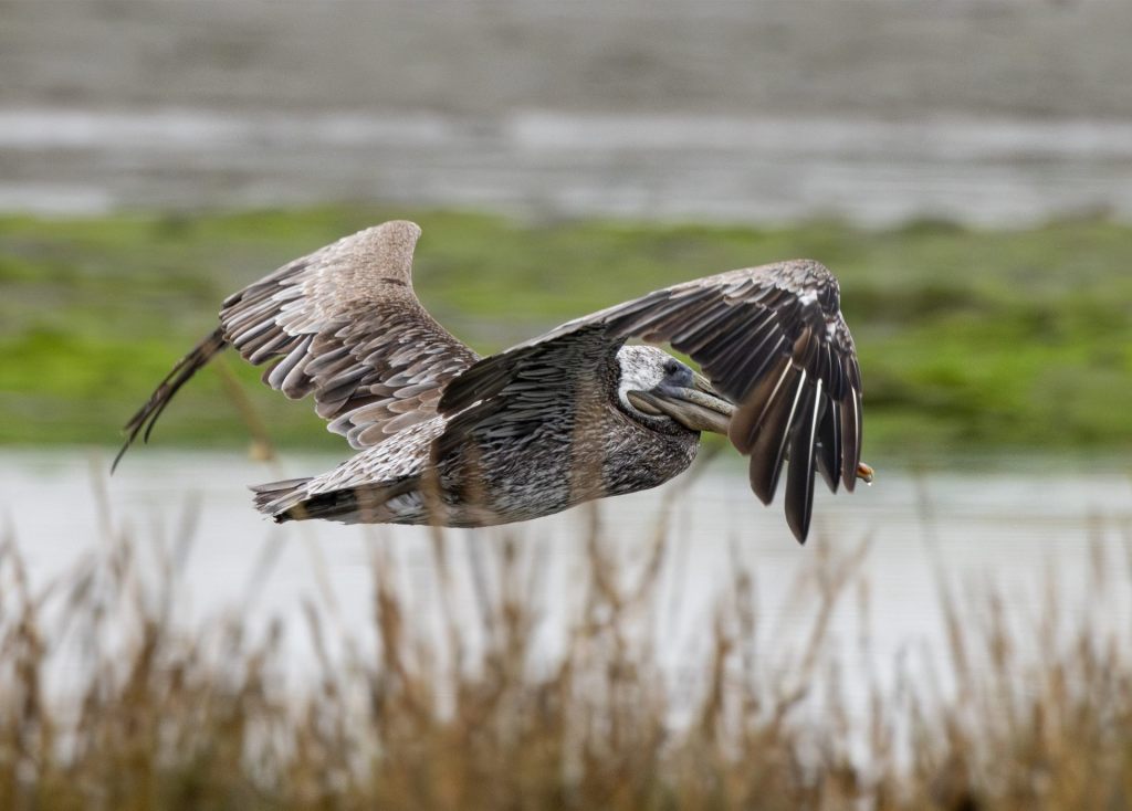 Juvenile Brown Pelican cruising byat low altitude.Two adults in the water and a juvenile coming in for a landing, with Marbled Godwits(18 inches from crown to tail)and tiny peeps (6-7 inches) on the shore in the foreground for size comparison. Pelicans are up to 54 inches crown to tail and can have an 8 foot wingspan.Adult on right, juvenile preening and showing off its handsome black crown on the left.Showing off the impressive wingspan.