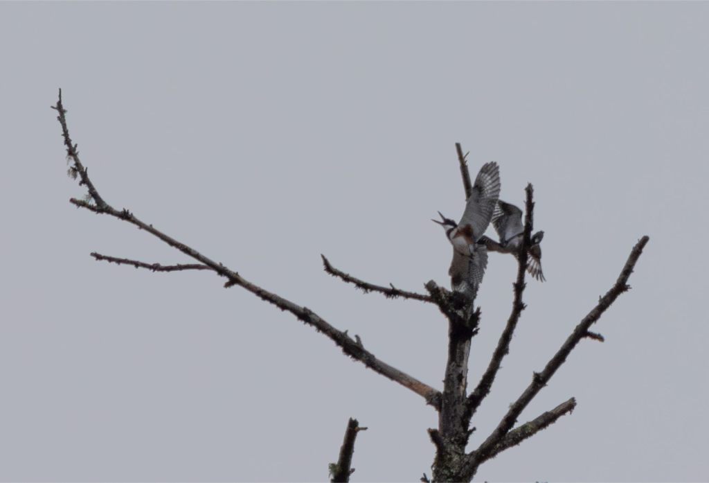 Breeding season being over, and Kingfishers not taking lifelong mates, it’s hard to imagine this was some kind of pair bonding, but neither was it a territorial battle because of the intermissions during which the two would sit perched in close proximity quietly. There was no competition for prey; in fact neither bird showed any interest in hunting at all, although on several occasions, one would hit the water as if in pursuit of a fish, but actually appearing to make some kind of emphatic statement.