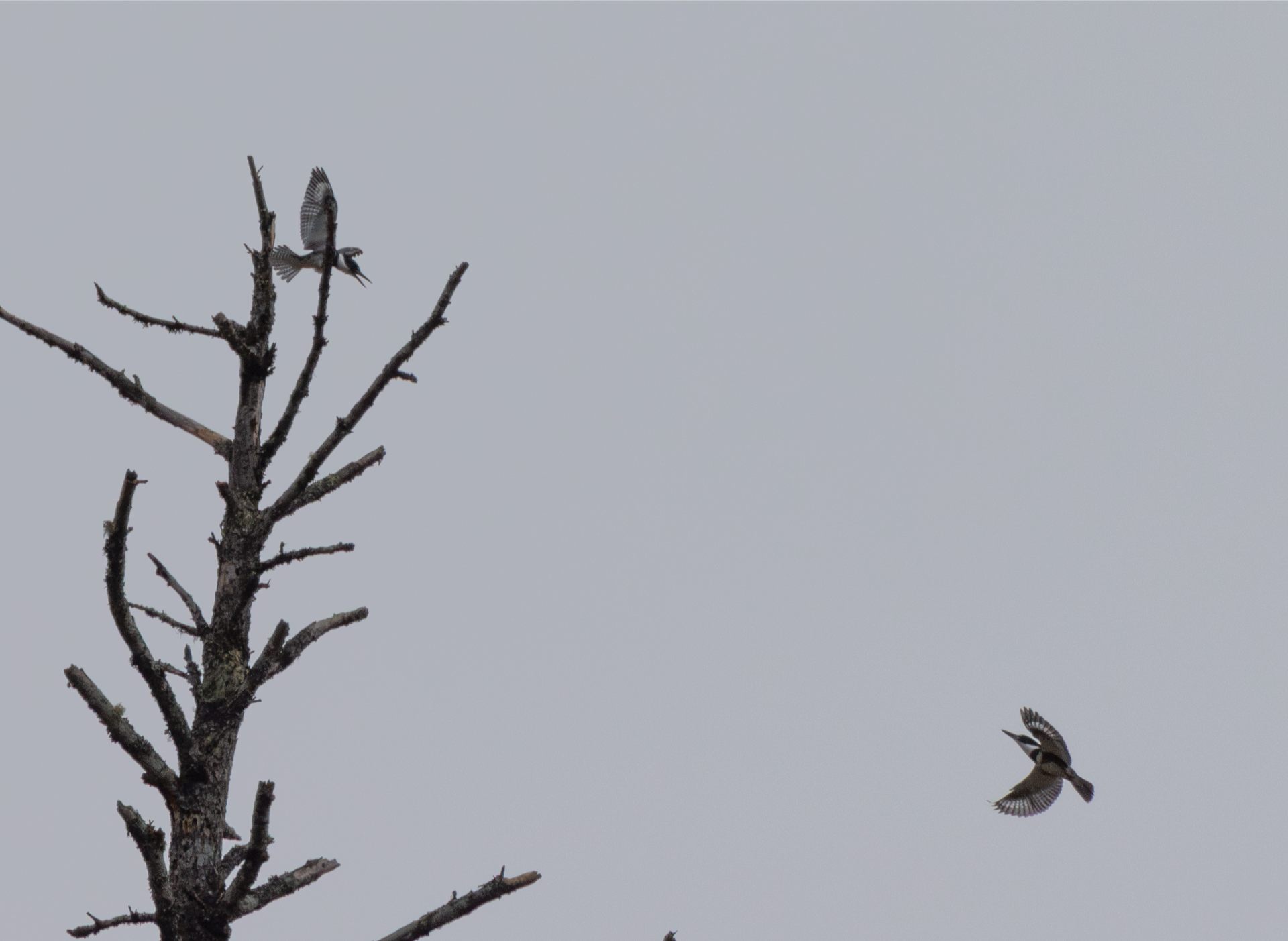 Breeding season being over, and Kingfishers not taking lifelong mates, it’s hard to imagine this was some kind of pair bonding, but neither was it a territorial battle because of the intermissions during which the two would sit perched in close proximity quietly. There was no competition for prey; in fact neither bird showed any interest in hunting at all, although on several occasions, one would hit the water as if in pursuit of a fish, but actually appearing to make some kind of emphatic statement.
