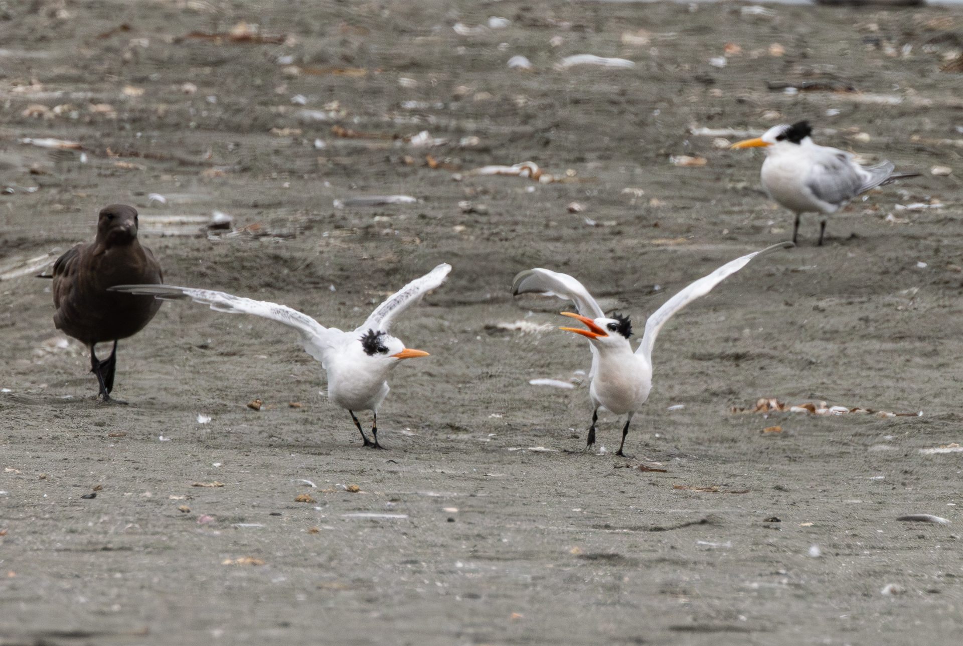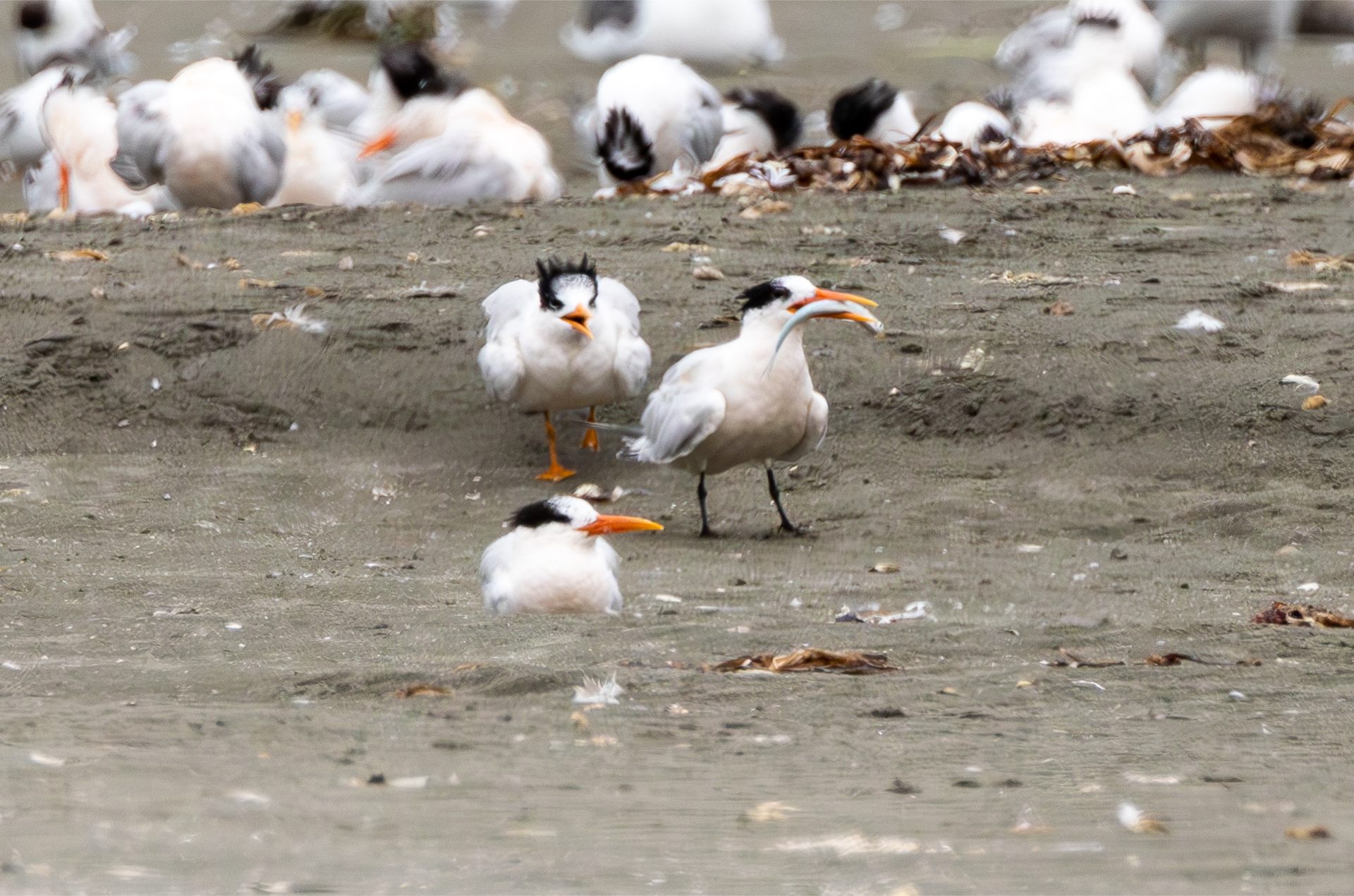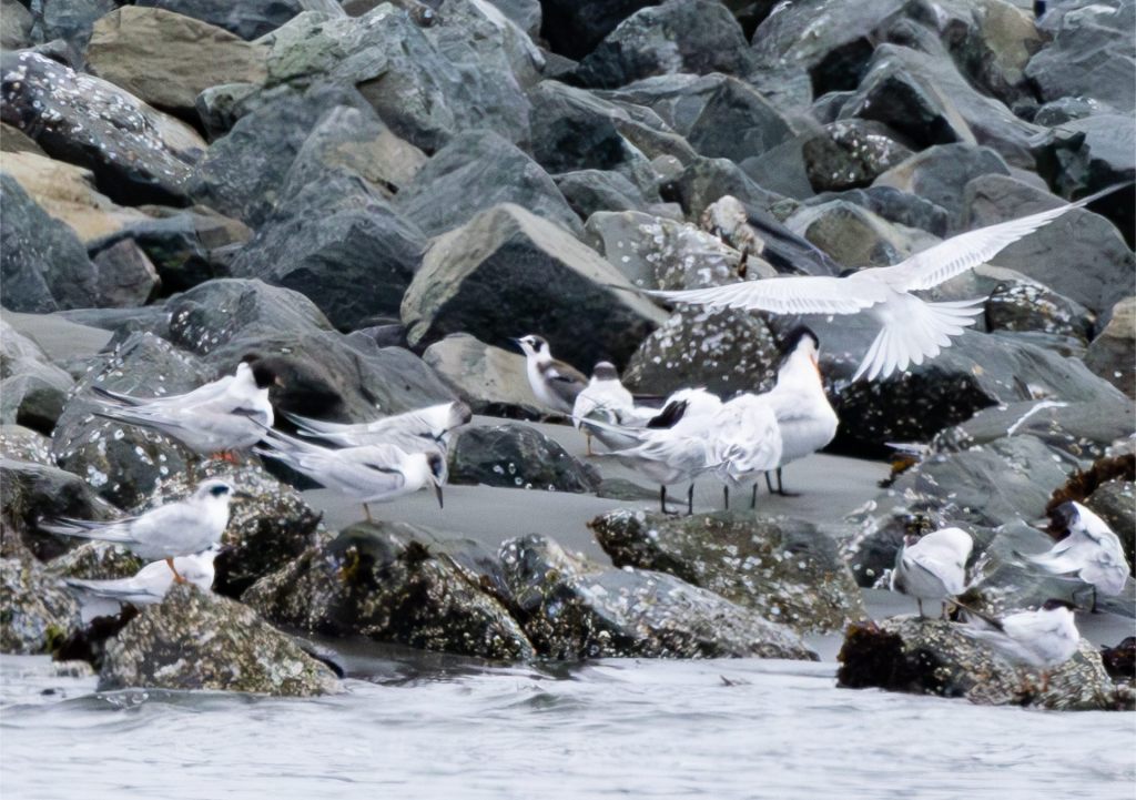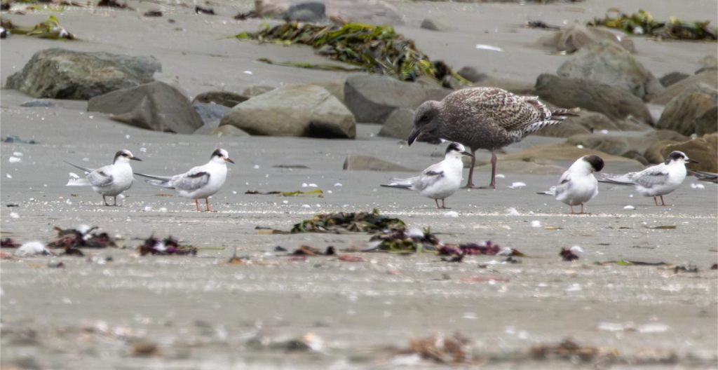 September is the best month for terns in Humboldt County and this year it was possible to see six species in one day near the tip of South Spit in a sandy cove on the bay side of the skinny peninsula, just south of the breakwater. Most numerous are the Elegant Terns, who breed in colonies in Mexico and then disperse both north and south, many hundreds of them come to Humboldt Bay. They are grouped among the larger terns and the golden, long, slightly down-turned bill indeed gives them an elegant look.