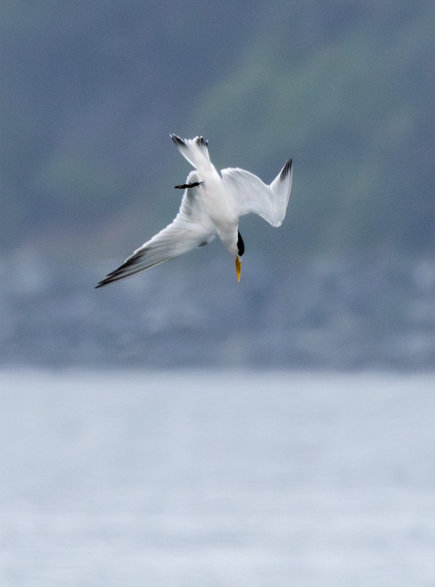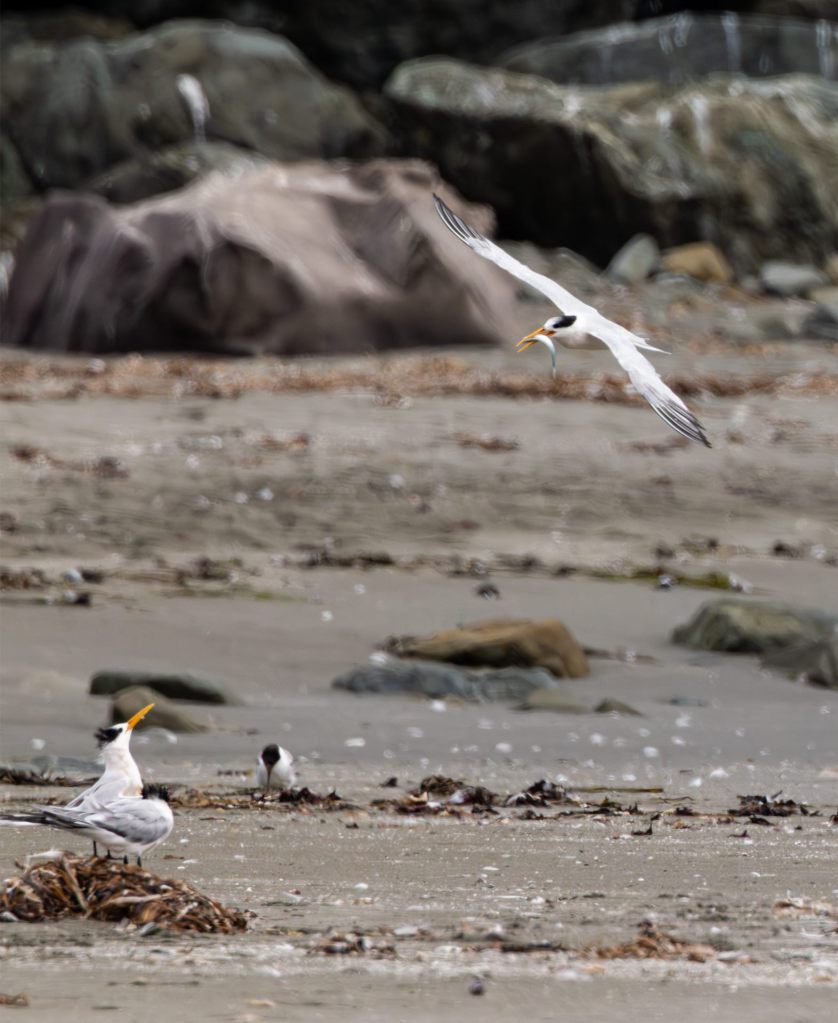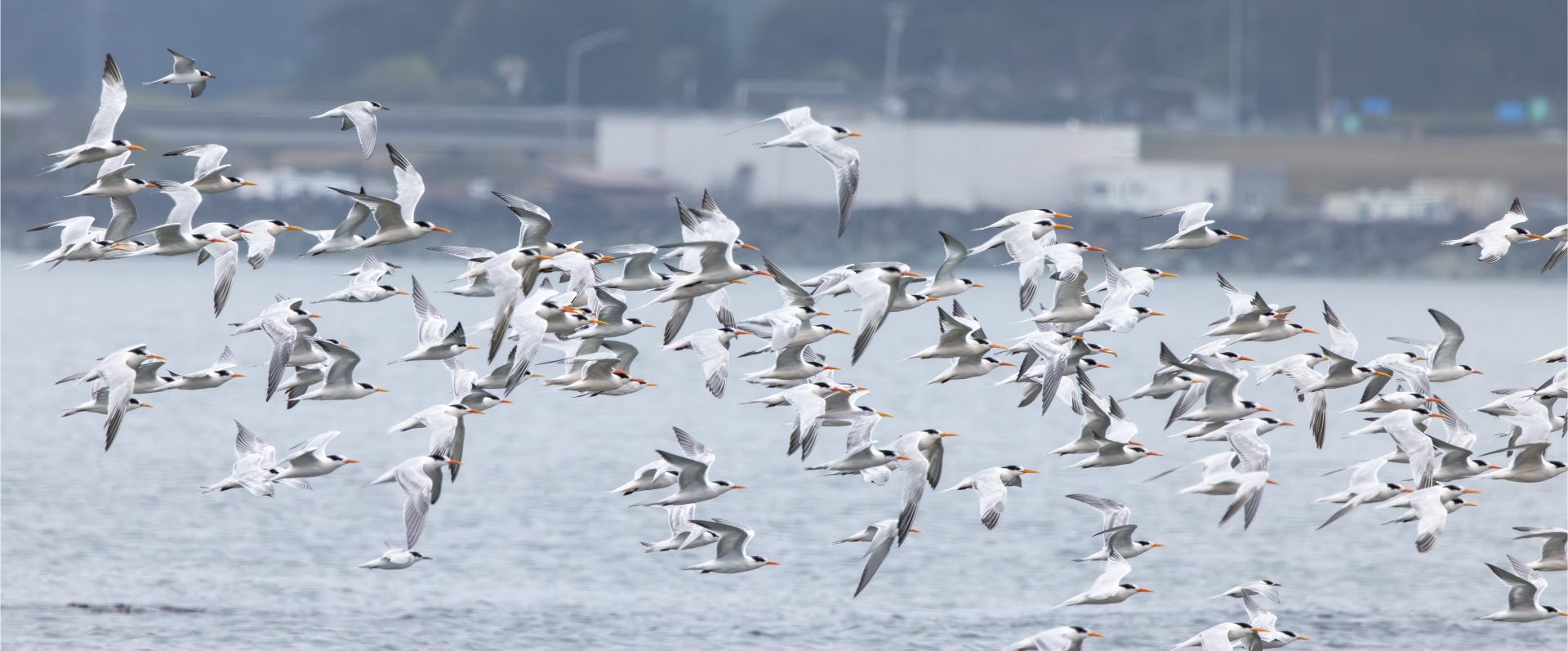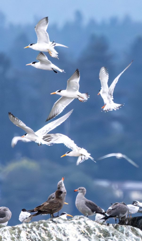 It is the season of terns on Humboldt Bay. These species of birds are in the same family as gulls, but you can see the difference in an instant. Gulls are heavy and slow, terns are so light and agile they have an almost insect-like weightlessness as they twist and turn on long pointy wings. Gulls are opportunistic feeders and often scavengers and have learned to make their living at landfills and dumps where birders hold their noses in search of rarities. Terns are plunge divers (most of them anyway) for small fish prey and would never be so at ease among humans as to strut into a seaside convenience store to nab a bag of chips.