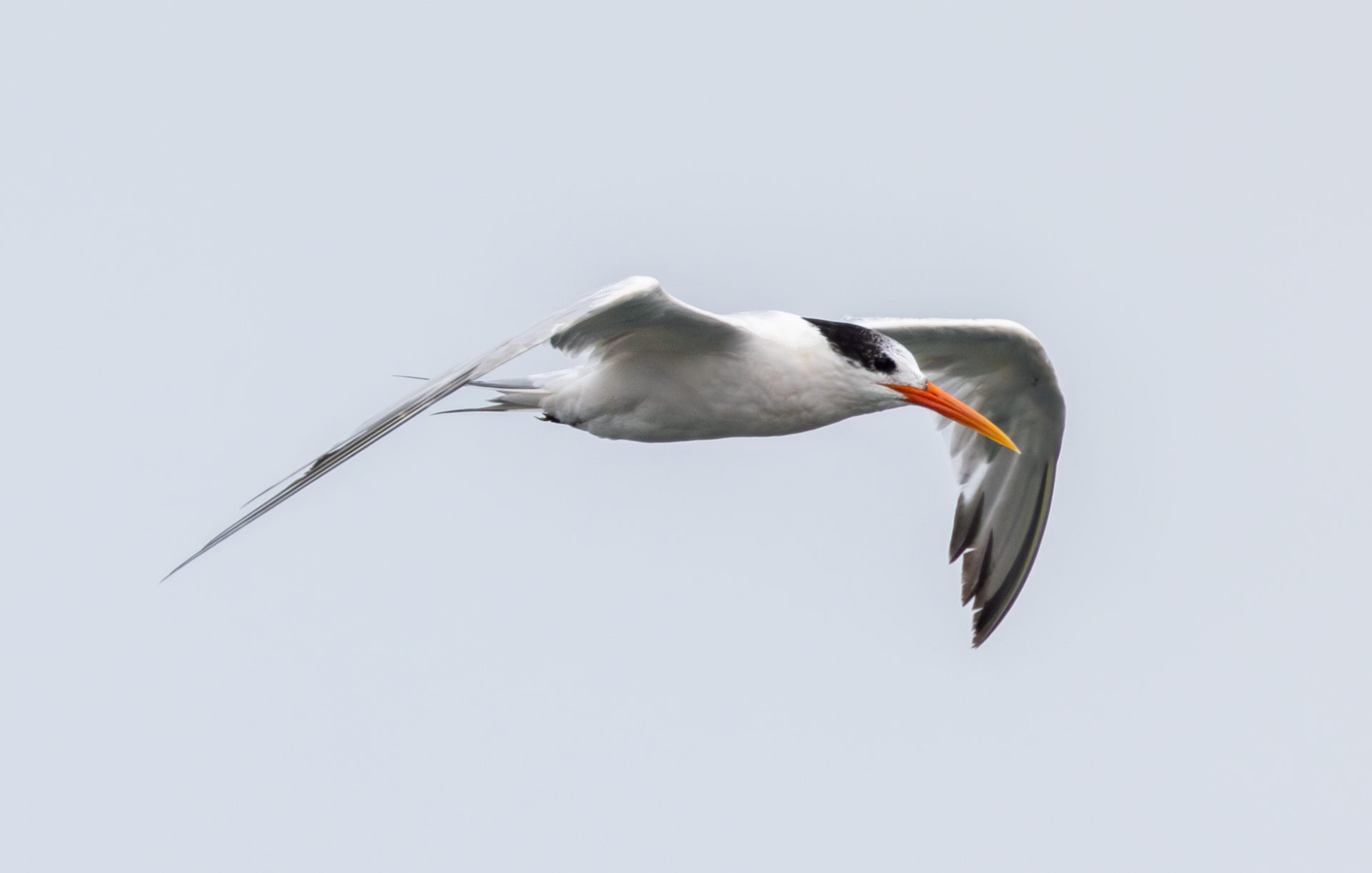 The world’s largest tern is the Caspian, and it is found on every continent but Antarctica. In September, Caspians, with their bulky appearance and stout neon red bills, have finished their breeding season and are starting to thin out as they begin to head south for the winter.