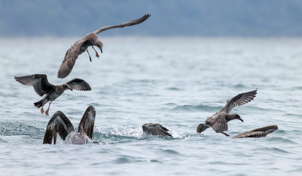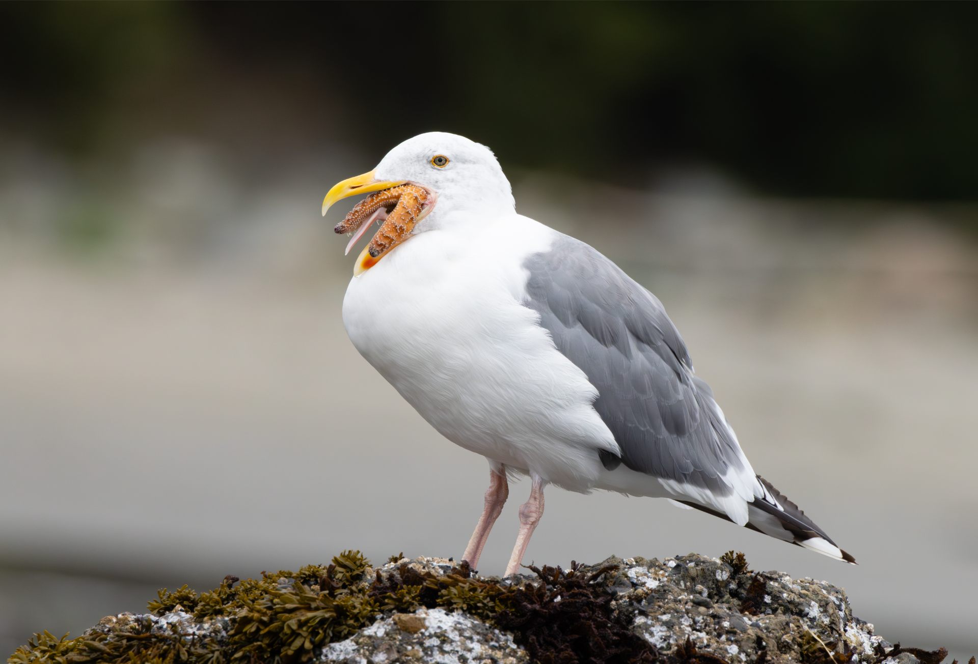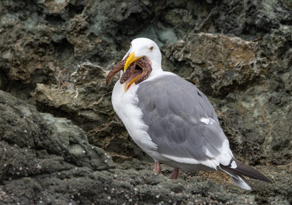 As we neared the shore, I was feeling a little sad that this time in the healing waters of Trinidad Bay was coming to an end. But the sight of a couple Western Gulls giving new meaning to the term “slow food” brightened the mood. The gulls had captured starfish too big to swallow in one gulp and were using their strong bill and throat to hold onto the prey as they patiently waited for it to weaken so the well-defended animal could be consumed. I’ve watched herons and egrets choke down huge fish and gophers with some difficulty, and I’ve seen a Common Merganser take over ten minutes to swallow a Pacific Lamprey that might have outweighed her, but this looked like a task requiring even more patience. It can take over an hour for a starfish to succumb and be completely swallowed.