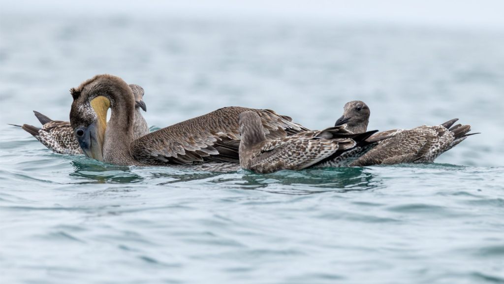 A wildlife biologist with encyclopedic knowledge of this environment’s inhabitants, and completely at ease steering the kayak around in water that was a bit rougher than we’d hoped for, Oso kept up a detailed narrative of what we were seeing and where we were going to maximize chances of finding the murrelets. Where pelicans and their groupies were, there were likely fish the murrelets would also be drawn to.