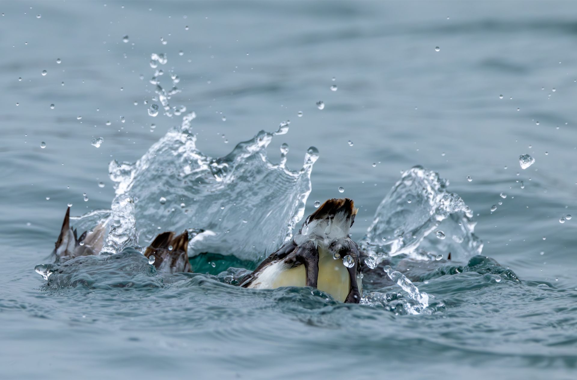 I got to sit in the front of a 2-person ocean kayak and my knowledgeable guide, who goes by Oso Feliz, did all the work as we looked for the Murrelets while I took pictures. Before launching I was supplied with a life vest and a dry suit to keep the elements on the outside. There was a safety talk and reassurance that we weren’t going to dump but if we did, everything would be OK. I’m convinced that getting into a dry suit should be an Olympic sport, but with patient assistance from Oso I was finally sealed and zipped into that diabolical garment and ready to go.