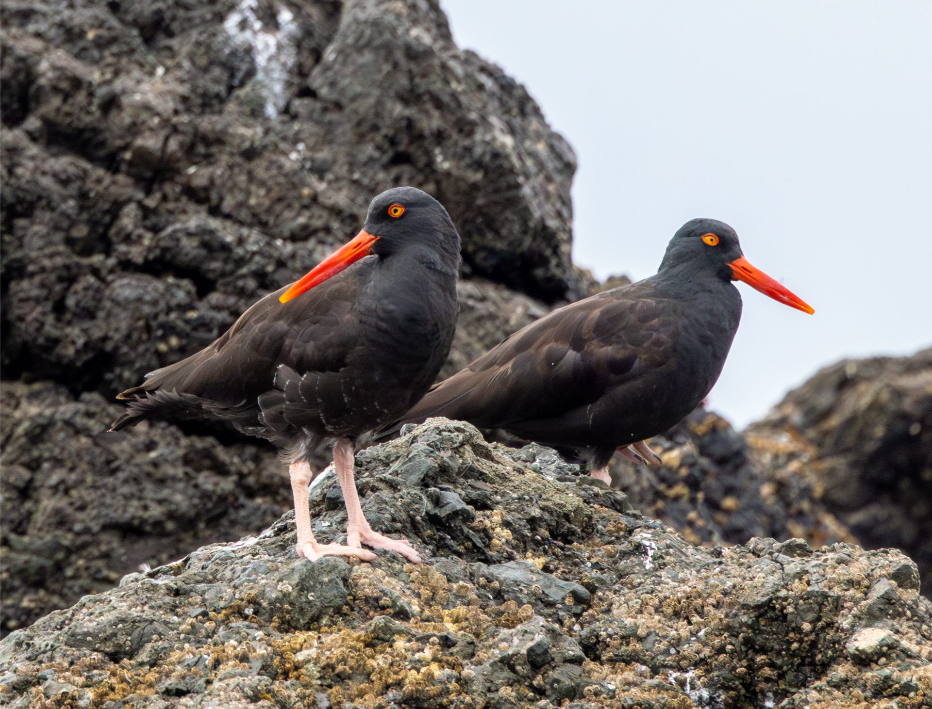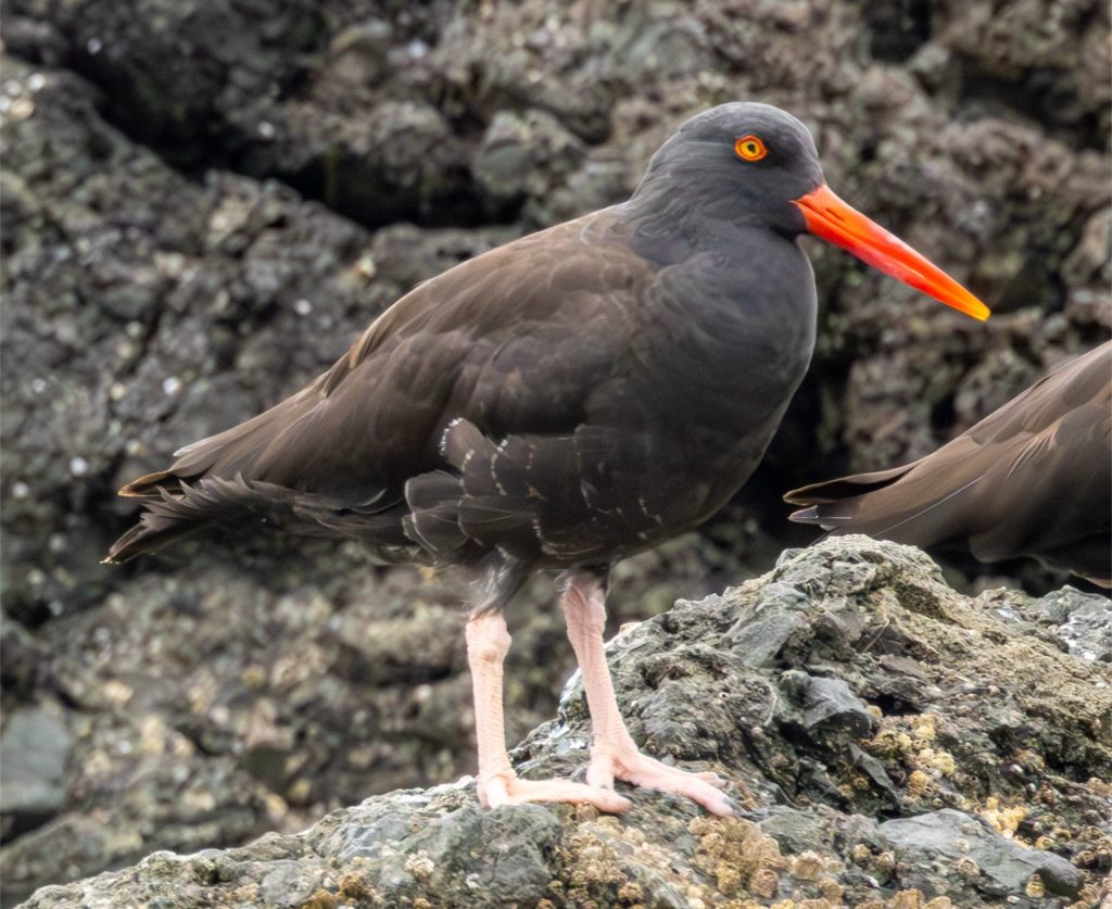 There were several pairs of Black Oystercatchers standing on some of the rocks, another bird we sometimes see at Shelter Cove. A plain dark bird with bright orange eyes and a long, stocky neon red bill used to pry prey off of rocks, Black Oystercatchers range all along the Pacific coast of North America, from southern California to Alaska.