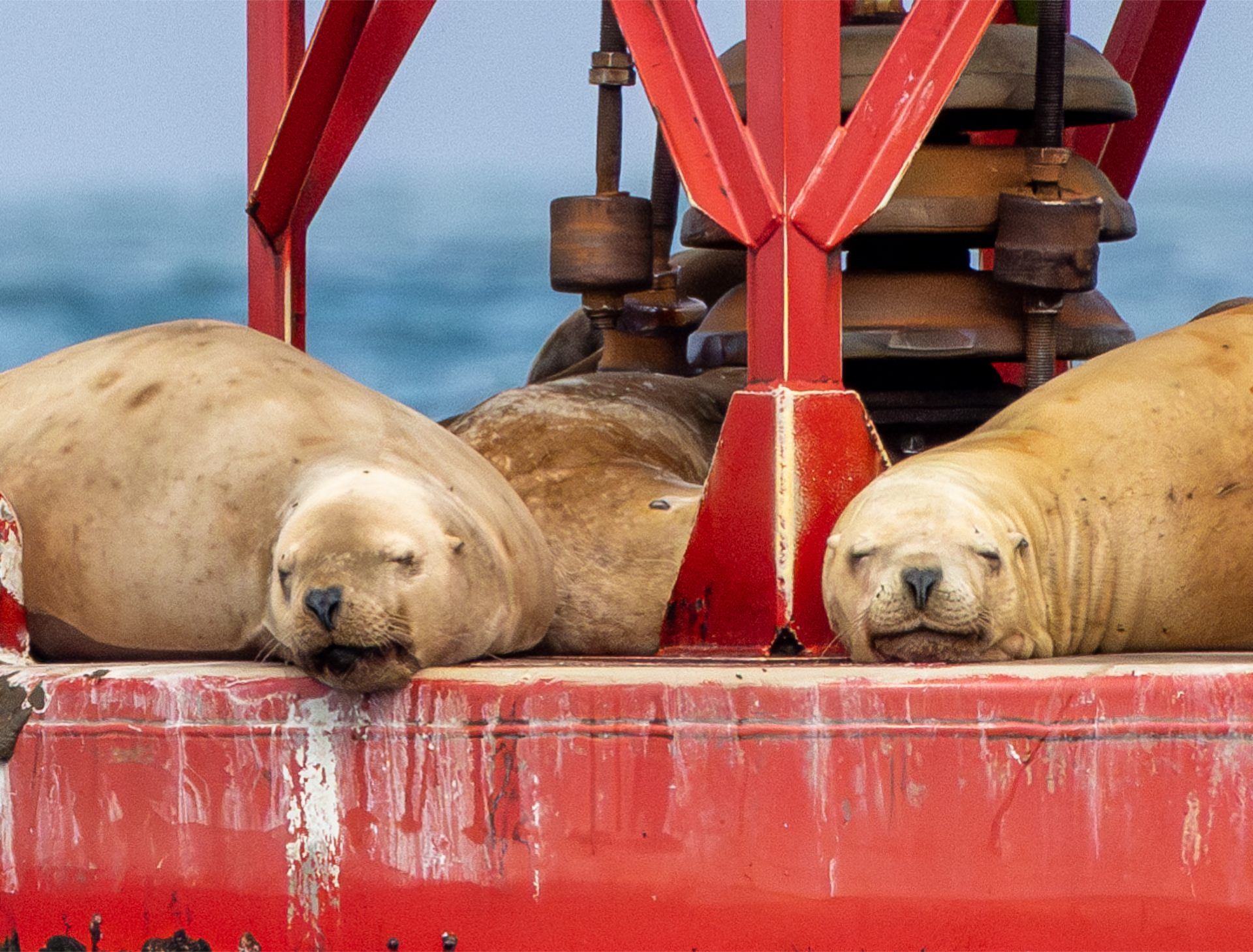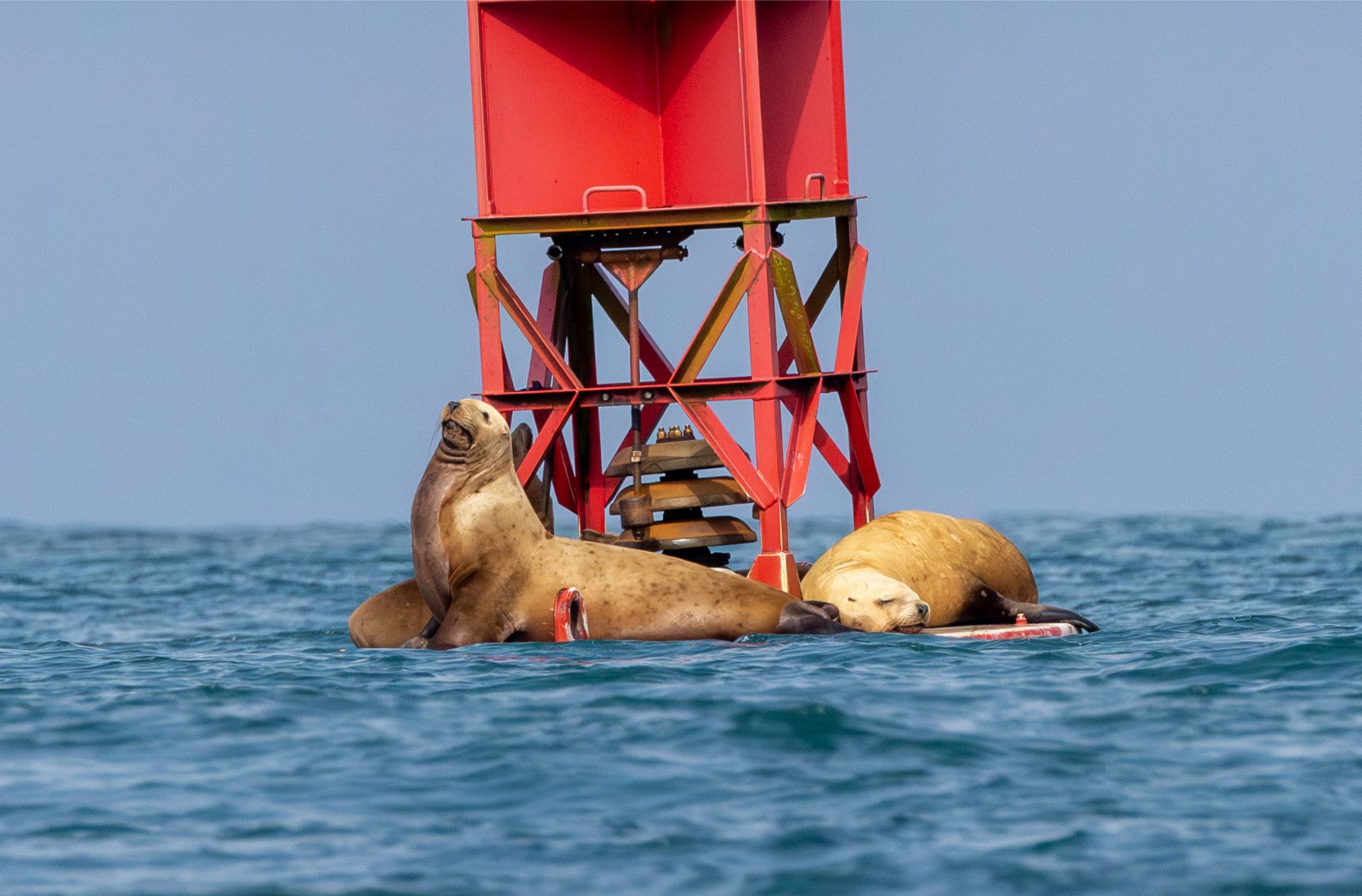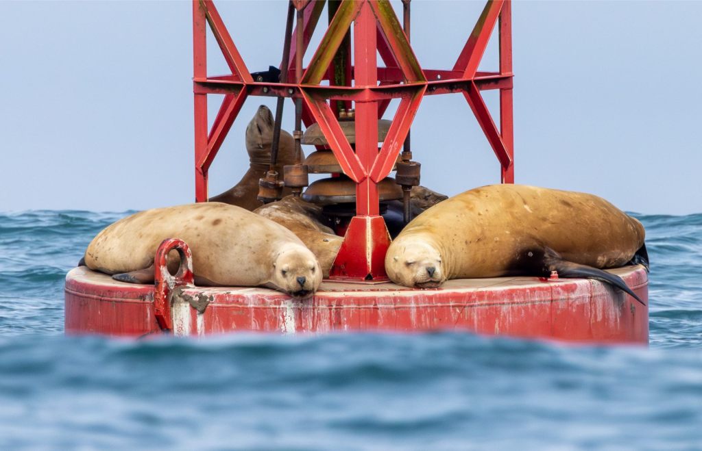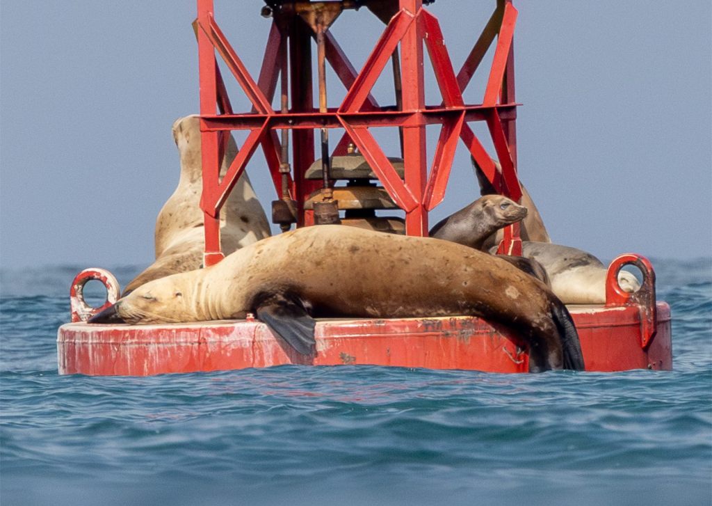 Oso kept offering to extend the trip and I was more than happy to do so. We made our way out toward a huge red buoy, upon which lounged what looked like a whole family of Steller’s Sea Lions. These massive beasts range along the northern Pacific coasts of North America and Asia. Males can weigh up to 2500 pounds and females up to 1000 pounds. Dwarfing the California Sea Lions we see at Shelter Cove, the adults are lighter in color and Oso pointed out their lion-like visage as well as their roar-like vocalizations we could hear even from a distance.